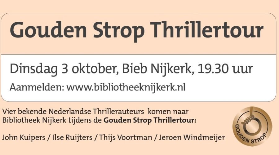 Op 3 oktober wordt een thrilleravond georganiseerd in de Nijkerkse Bibliotheek. Tijdens deze avond worden gesprekken gevoerd met vier Nederlandse thrillerschrijvers, die allen genomineerd zijn en/of een bekende thrillerprijs gewonnen hebben. Bibliotheekcollega Jamie Lee van Londen gaat met de auteurs in gesprek. Naast dat het inhoudelijk over hun boeken gaat, komen diverse onderwerpen aanbod en tipje van de sluier: