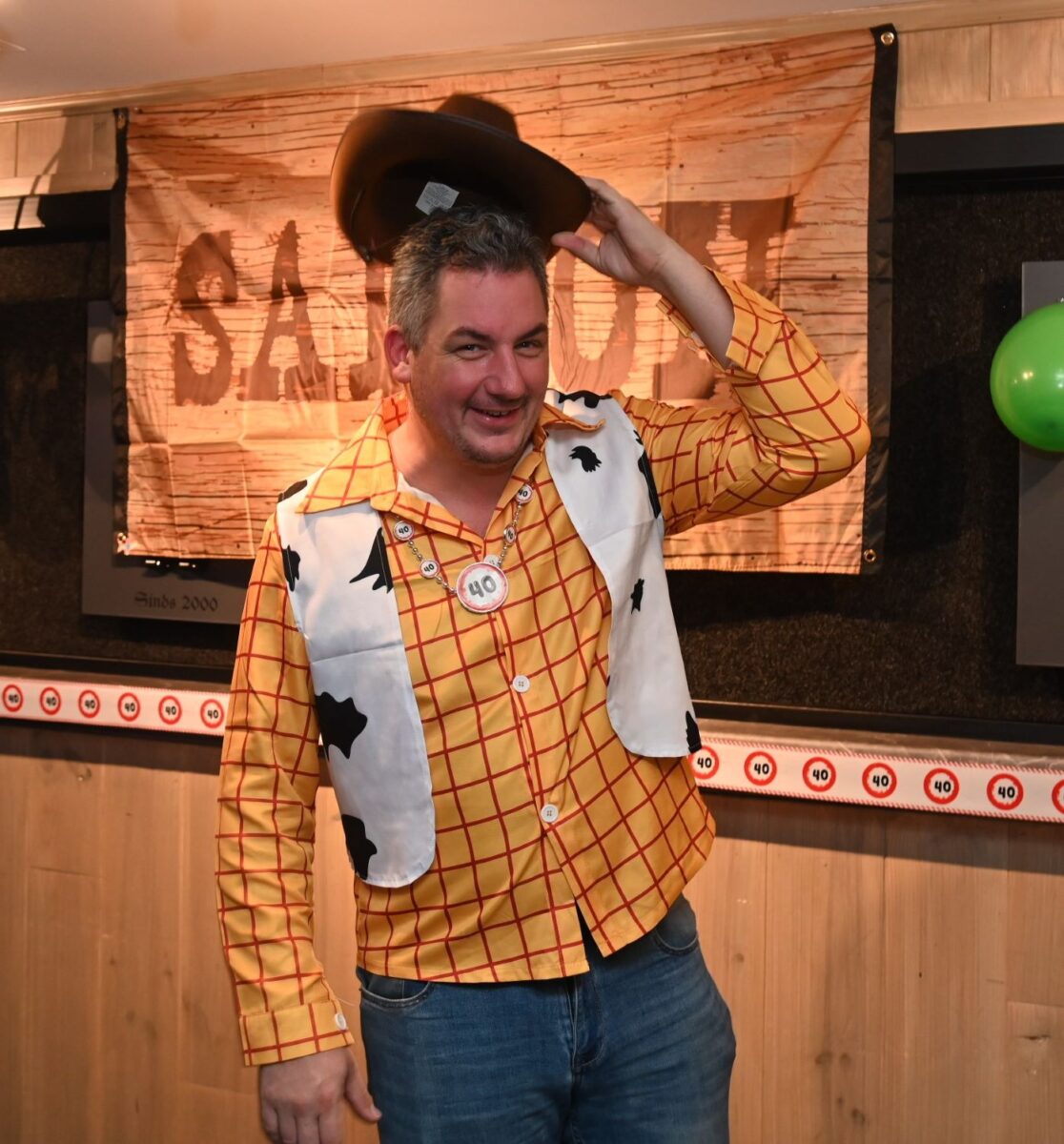 Tim Droogsma heeft zaterdagavond 8 november zijn veertigste verjaardag in stijl gevierd. De eigenaar van het bedrijf CAReFolie is een fervent darter en de zaal van de dartsvereniging Nijkerk was de perfecte basis voor een flink feestje. Iedereen was verkleed in country en westernstijl. En dat gebeurde tot in de details. Laat dat maar over aan zijn vrouw die eigenaresse is van de Disneywinkel in Nijkerk. Foto Kees van den Heuvel