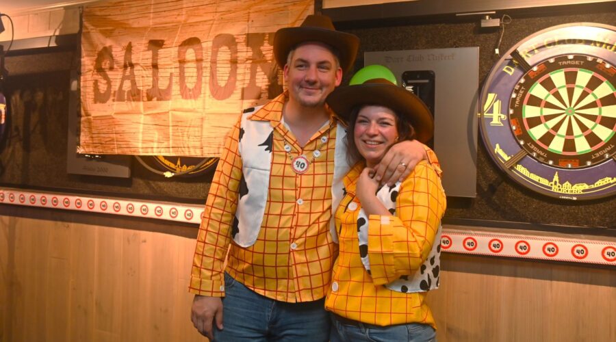 Tim Droogsma heeft zaterdagavond 8 november zijn veertigste verjaardag in stijl gevierd. De eigenaar van het bedrijf CAReFolie is een fervent darter en de zaal van de dartsvereniging Nijkerk was de perfecte basis voor een flink feestje. Iedereen was verkleed in country en westernstijl. En dat gebeurde tot in de details. Laat dat maar over aan zijn vrouw die eigenaresse is van de Disneywinkel in Nijkerk. Foto Kees van den Heuvel