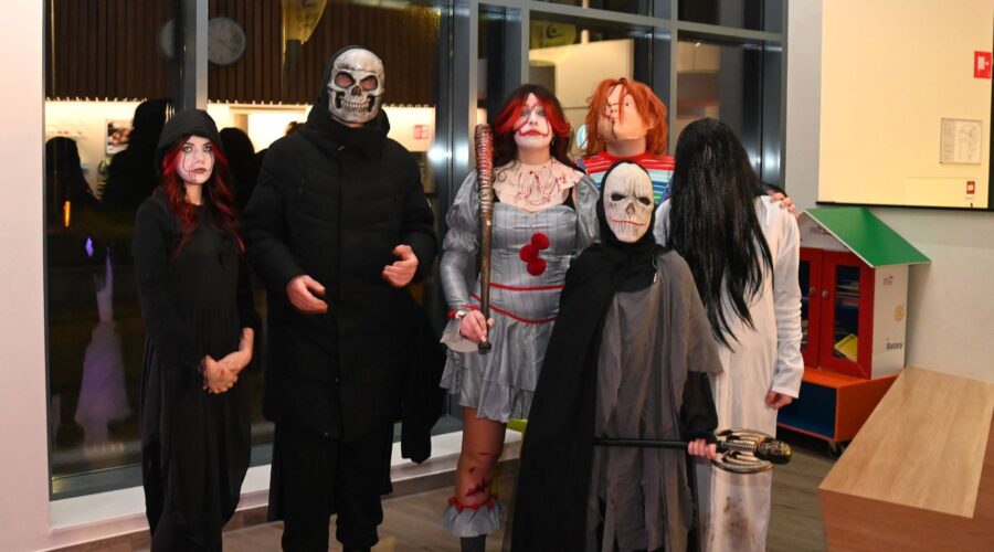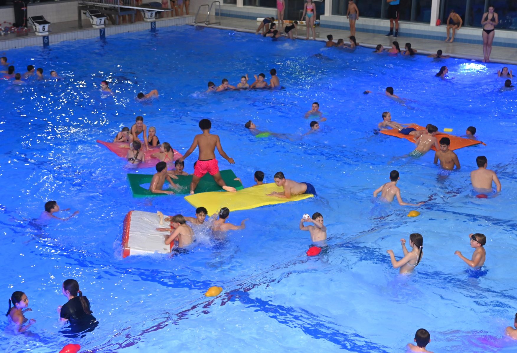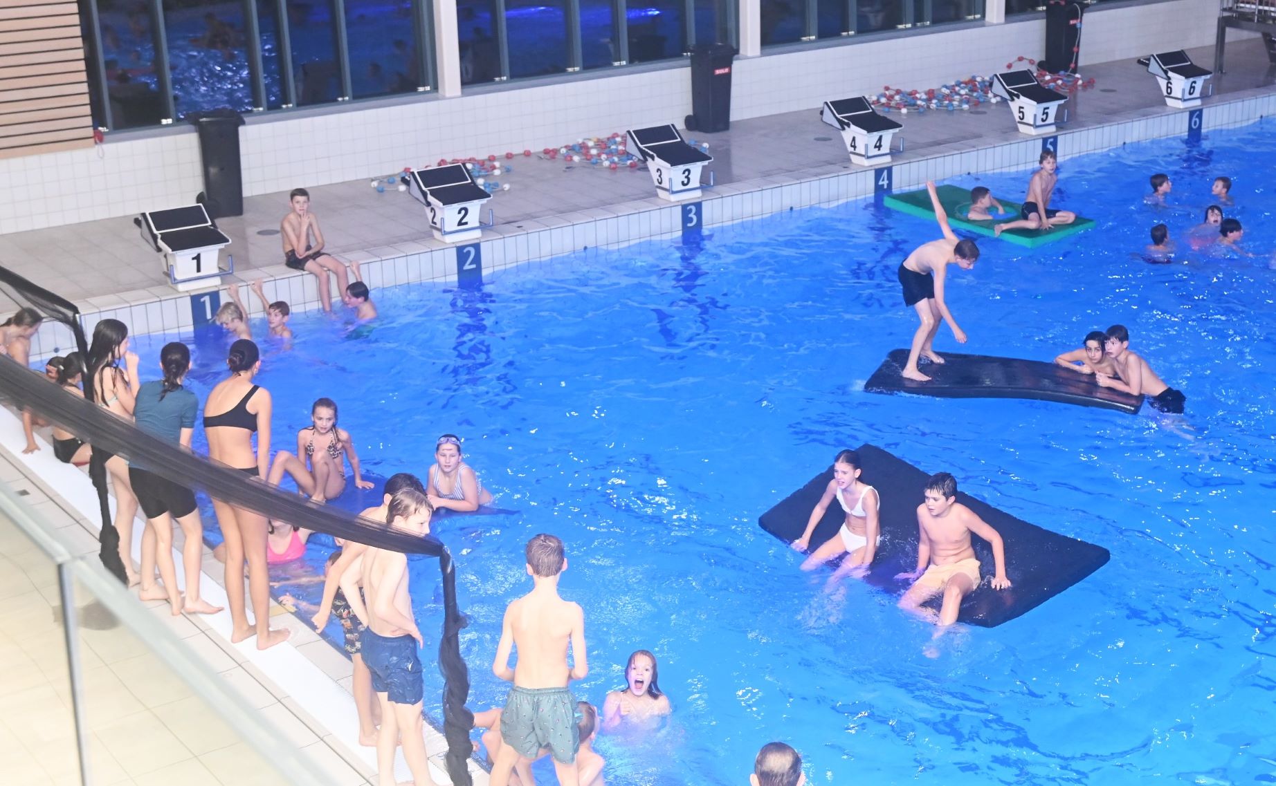 Het was vrijdagavond 31 oktober superdruk maar ook erg eng tijdens de Halloween-versie van de disco in het Jaap van der Krol-bad in Nijkerk. Voordat ze konden gaan zwemmen moesten de jeugdige badgasten eerst een parcours afleggen. Daar kwamen de zwemmers eerst langs diverse enge gasten en was het gegil niet van de lucht. Binnen was het zwembad in Halloween-sfeer aangepast en plonsden de kinderen, naar schatting enkele honderden, maar wat graag in het water. Foto Kees van den Heuvel