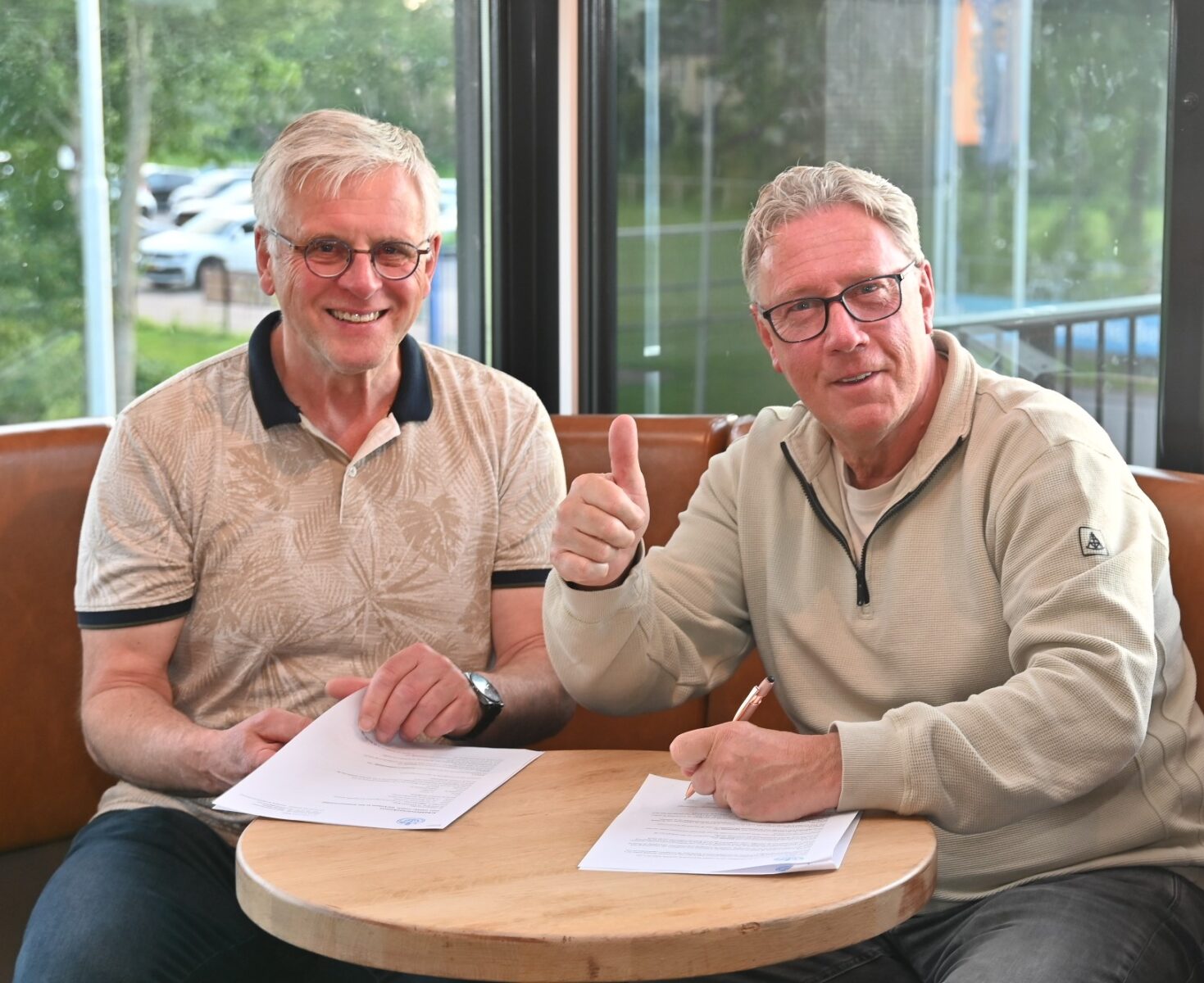 Trainer Jeroen Peters heeft zijn contract met voetbalvereniging Veensche Boys met een jaar verlengd. De oefenmeester uit Leusden viel afgelopen seizoen halverwege in en het lukte hem om Veensche Boys te handhaven in de eerste klasse. In de kantine van Veensche Boys is maandagavond 2 juni in aanwezigheid van het bestuur een eenjarig contract getekend. Foto Kees van den Heuvel