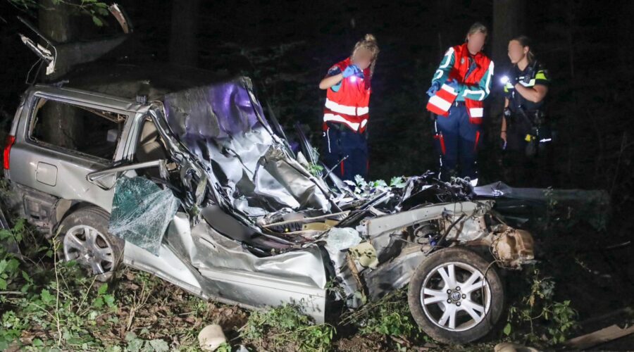 Aan de Hunnenweg in het buitengebied van Voorthuizen is zaterdagavond rond 22:45 uur een ongeval gebeurd. De hulpdiensten waaronder de brandweer en een traumahelikopter werden met spoed opgeroepen. Een bestuurder van een auto was hard op een grindpad tegen een aantal bomen gekomen. De afdrukken van de auto stonden op zeker 1,5 meter in een aantal bomen. De ravage was enorm. Er zaten twee personen bekneld in het voertuig. Beide personen zijn ter plaatse overleden. Het motorblok lag tientallen meters van het voertuig vandaan. Met een politie helikopter is boven het gebied gezocht naar meer slachtoffers. In de omgeving werd een fatebike aangetroffen maar voor zover bekend was dat toevallig. Om uit te sluiten dat er geen fietser bij betrokken was, is de omgeving uitgekamd door onder meer een speurhond van de politie. Het tweetal kon pas enkele uren later door de brandweer bevrijd worden. De opgeroepen ambulancedienst en de traumahelikopter bemanning konden niks meer betekenen van de inzittenden van het voertuig met buitenlandse kentekenplaten. De Hunnenweg was door de aanrijding en het onderzoek volledig afgesloten voor verkeer. Foto’s WH fotografie