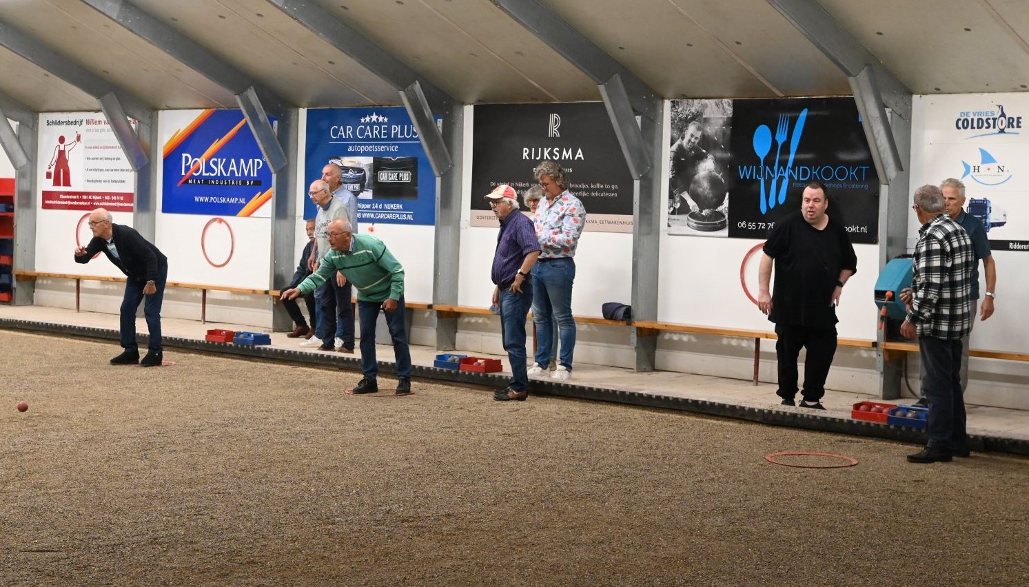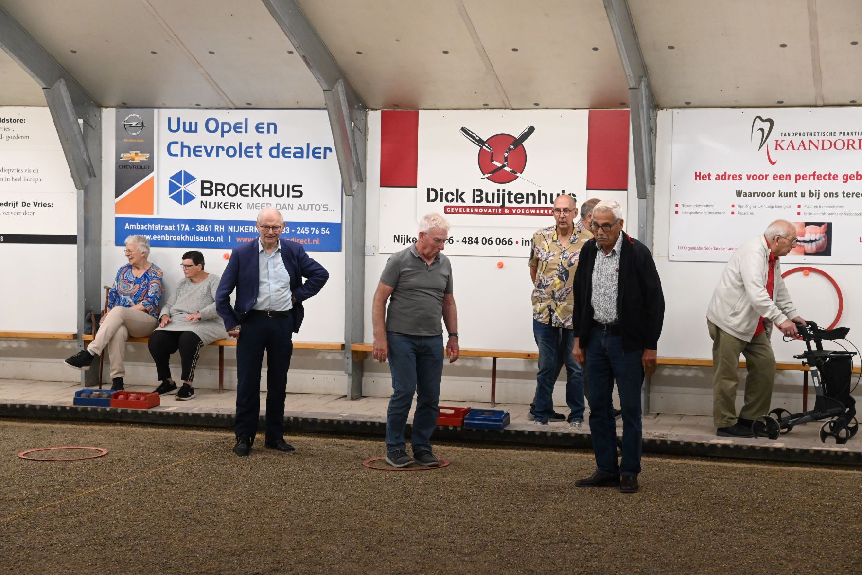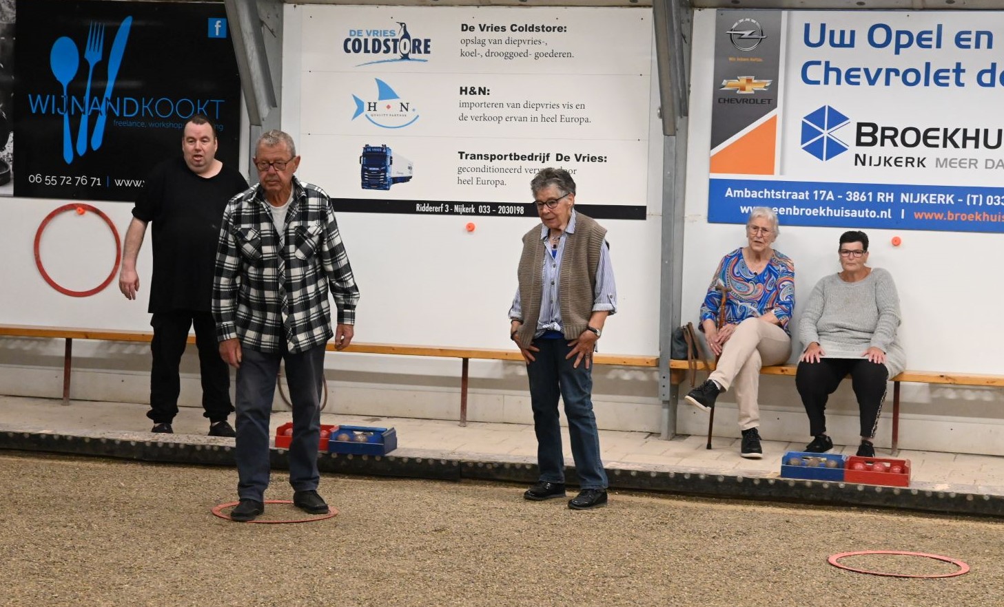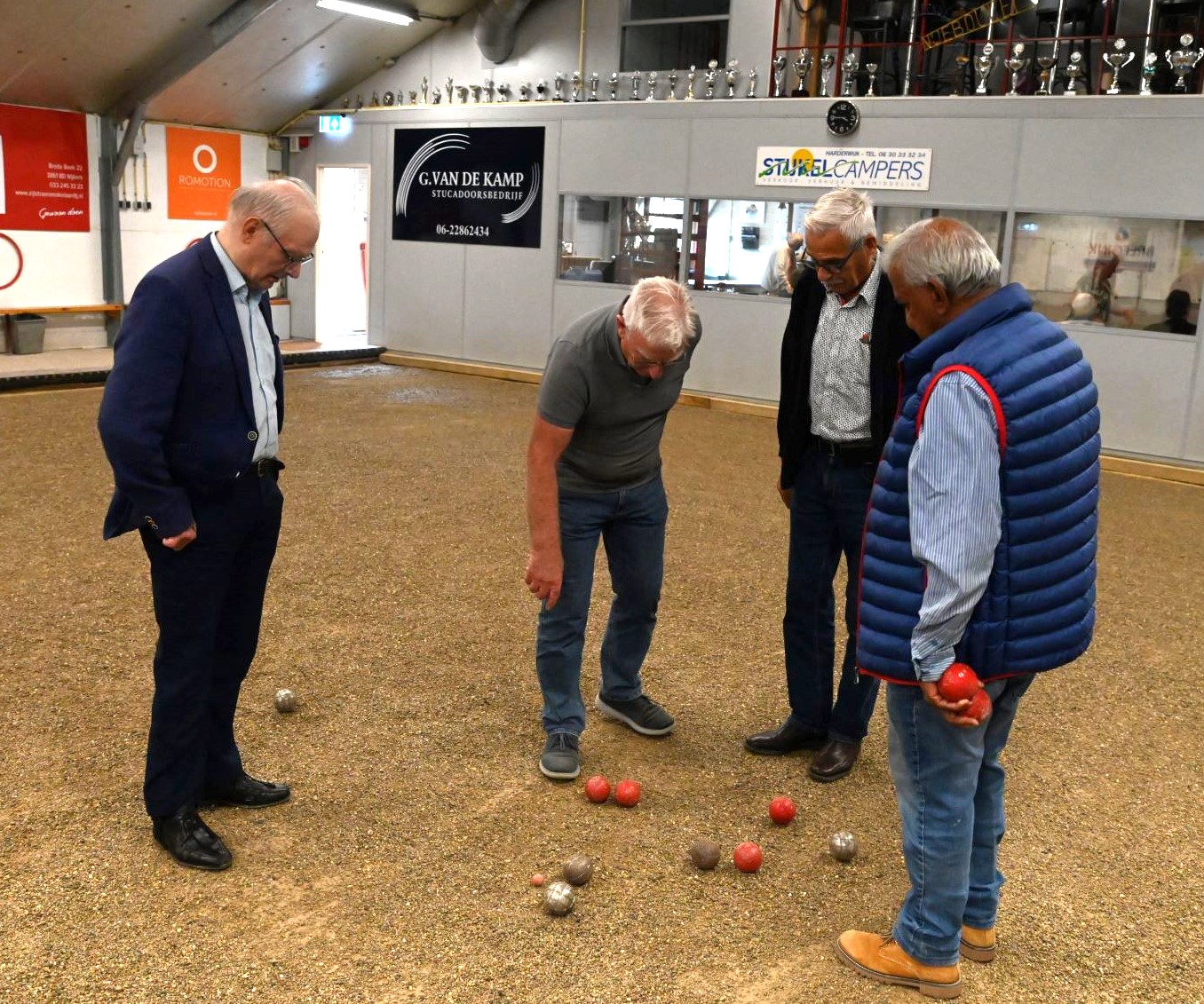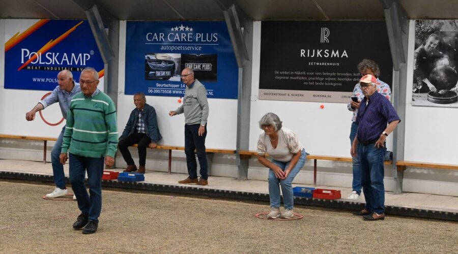 Voor haar jaarlijkse uitje bezocht de soos van de Unie van Vrijwilligers (UVV) donderdag 21 september het sportcomplex van de Jeu de Boulesvereniging De Nijeboulers in Nijkerk. Vanwege de regen vond het uitje binnen plaats en werd de senioren geleerd hoe het spel wordt gespeeld. Aan het einde van de middag was er een smaakvol diner. Foto Kees van den Heuvel