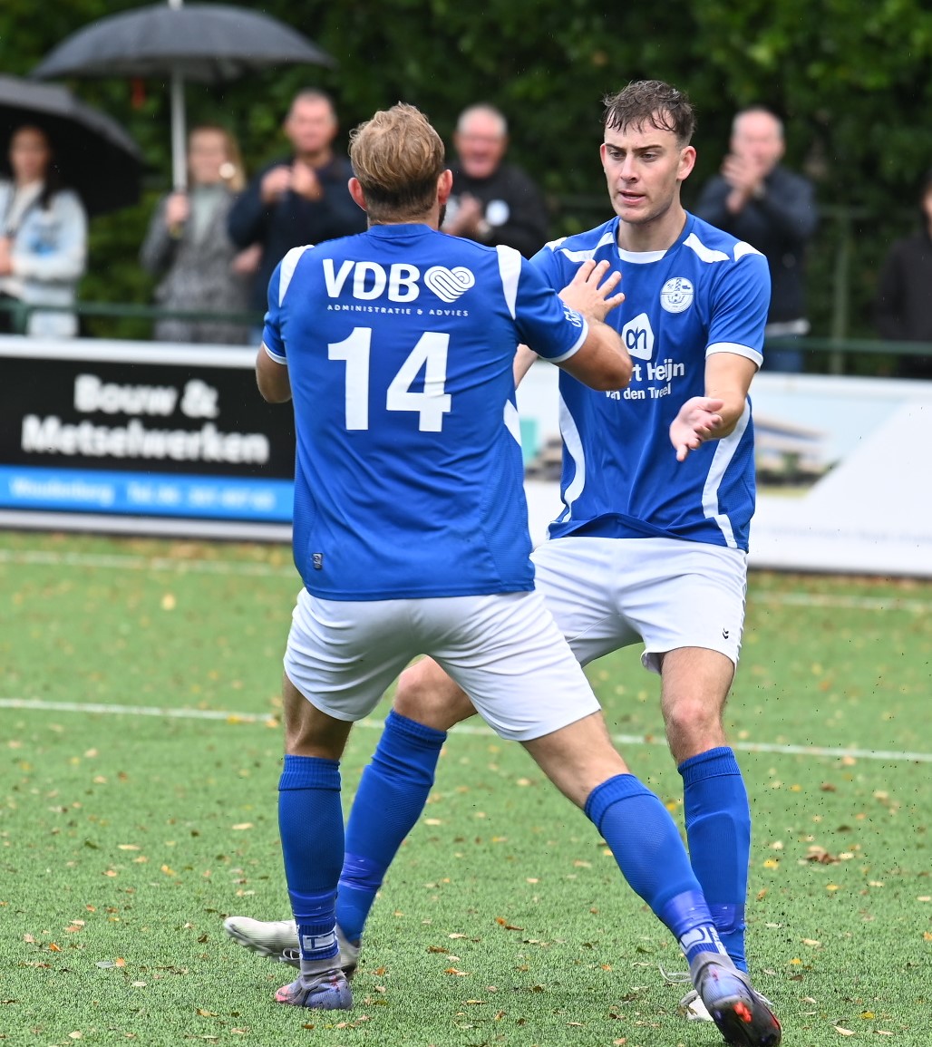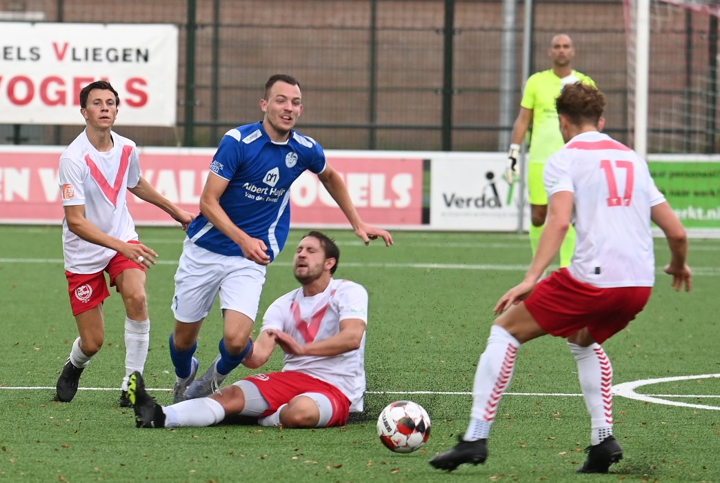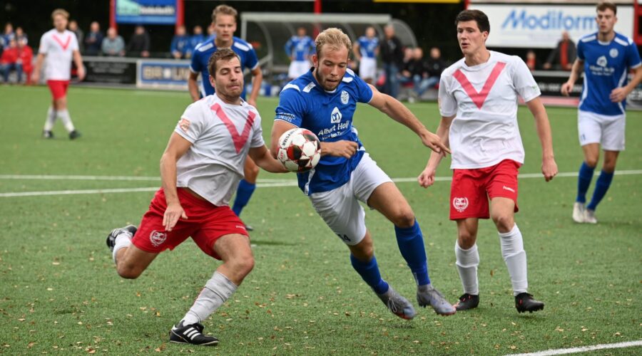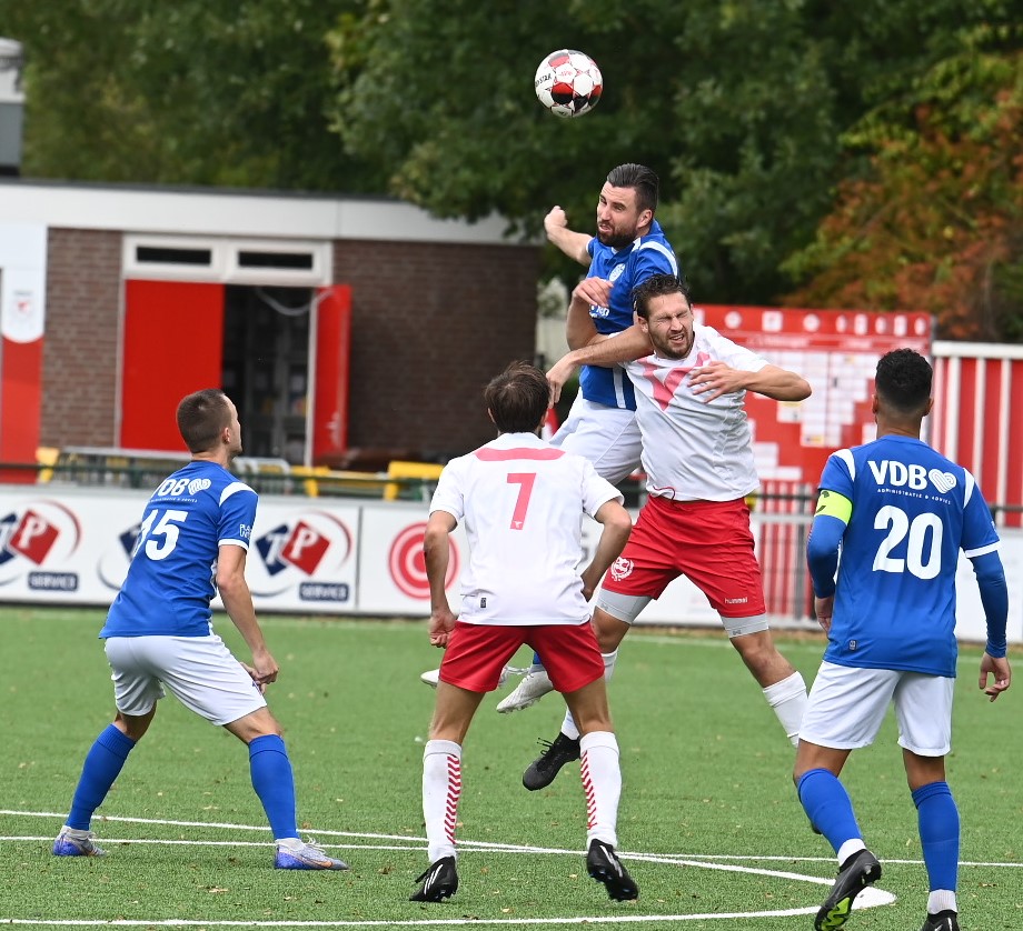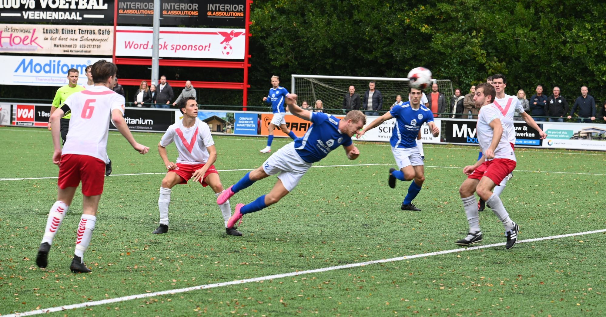 Veensche Boys heeft in haar eerste competitiewedstrijd gelijk gespeeld tegen de Valleivogels. In Scherpenzeel werd het 2-2. De doelpunten werden namens de Blauwe Helden gemaakt door Julian Buitenhuis en Corné Parol. In de eerste helft was Veensche Boys onherkenbaar. Het leek wel of de ploeg van trainer Erik Assink een beetje was bevangen door plankenkoorts. Het manco zat hem vooral achterin dat de voorbode was voor de eerste twee goals van de Valleivogels. Vanuit dode spelmomenten scoorden Alex van Eem en Mathijs van Dusschoten kopte de tweede erin. Tot die tijd was er slechts één kans van Rody Buitenhuis die tegen de keeper van de tegenstander aanschoot. Na een half uur spelen werd Veensche Boys wakker. Corné Parol speelde de bal voor de goal en het was Julian Buitenhuis die met zijn schoenen de bal in de nok joeg (2-1). Na rust was een heel ander Veensche Boys te zien. De ploeg uit Nijkerkerveen werkte hard om de gelijkmaker op het scorebord te zetten. En die kwam er ook. Julian Buitenhuis zette goed voor waarna Corné Parol scoorde. Daarna ging de Valleivogels op de pijnbank. In het laatste kwartier volgde een bombardement op de goalie van de Valleivogels, maar de ploeg uit Scherpenzeel kon zich ternauwernood de aanvalsdriften van Veensche Boys pareren. De grootste kans was voor Levi Haringsma, die de bal in de goal kopte, die door de keeper bijzonder fraai uit het doelgebied werd gewerkt. Waar in elk geval geen gebrek aan was, waren gele kaarten. Rik Doppenberg kreeg er zelfs twee en die moest met rood van het veld vertrekken. Ondanks de tien man was Veensche Boys evenwel sterker dan de opponent uit Scherpenzeel. Foto en tekst Kees van den Heuvel
