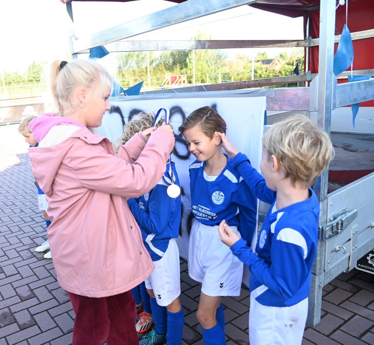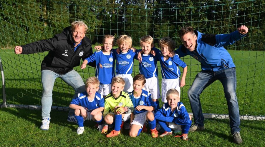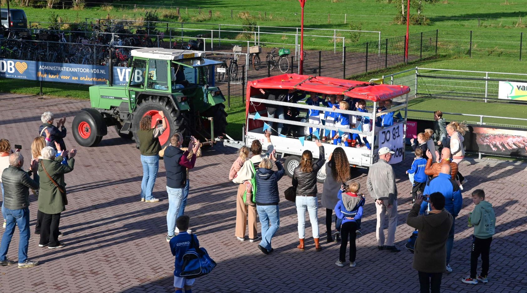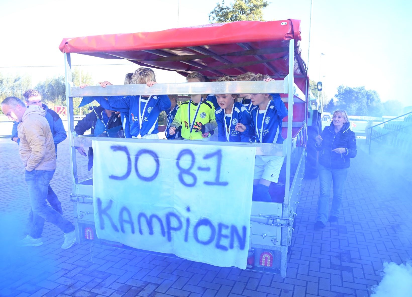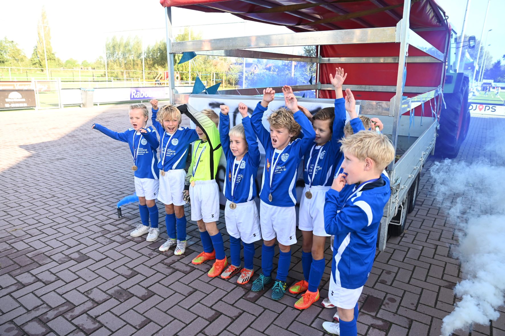 Wat een team. Veensche Boys JO8-1 is zaterdag 14 oktober al kampioen geworden door alles en iedereen te verslaan. Het afgelopen seizoen was een winst van 6-1 nog het minste resultaat. Het kampioenschap vond plaats in Ermelo waar de plaatselijke DVS moest worden verslagen. De tussenstand van 1-2 gaf aanvankelijk nog geen reden tot feestvreugde, maar nadien werd met liefst 1-14 gewonnen. In Nijkerkerveen aangekomen ontvingen de spelers een medaille, blauwwitte rookpotten en een rit op de wagen door het dorp. Foto Kees van den Heuvel