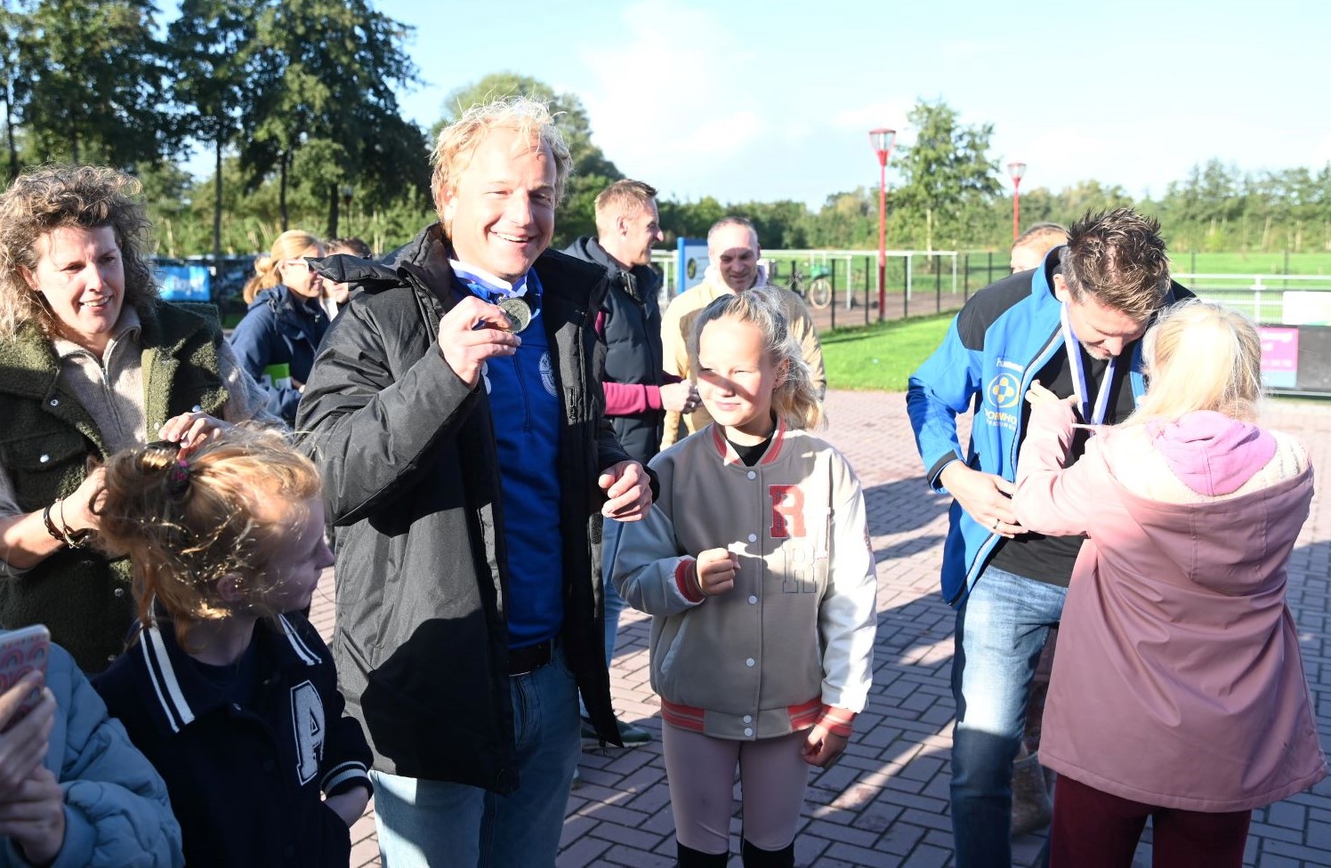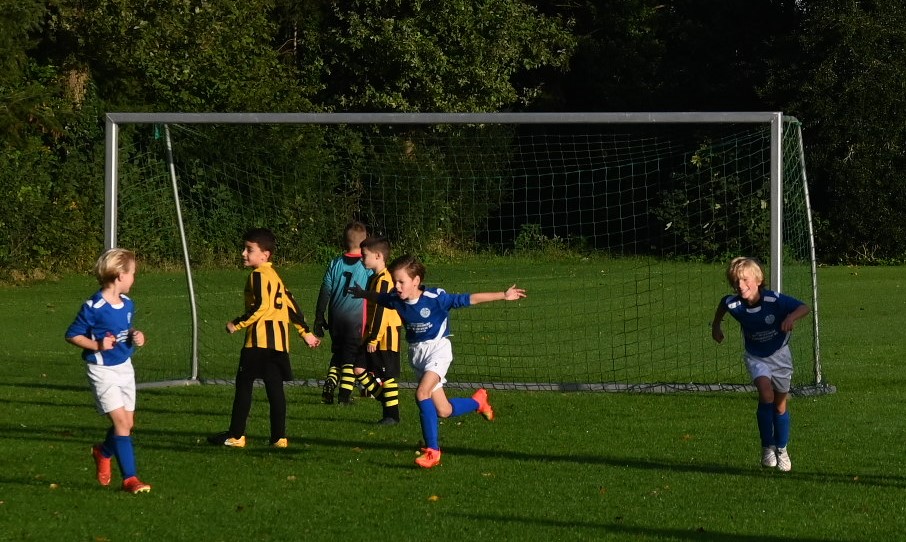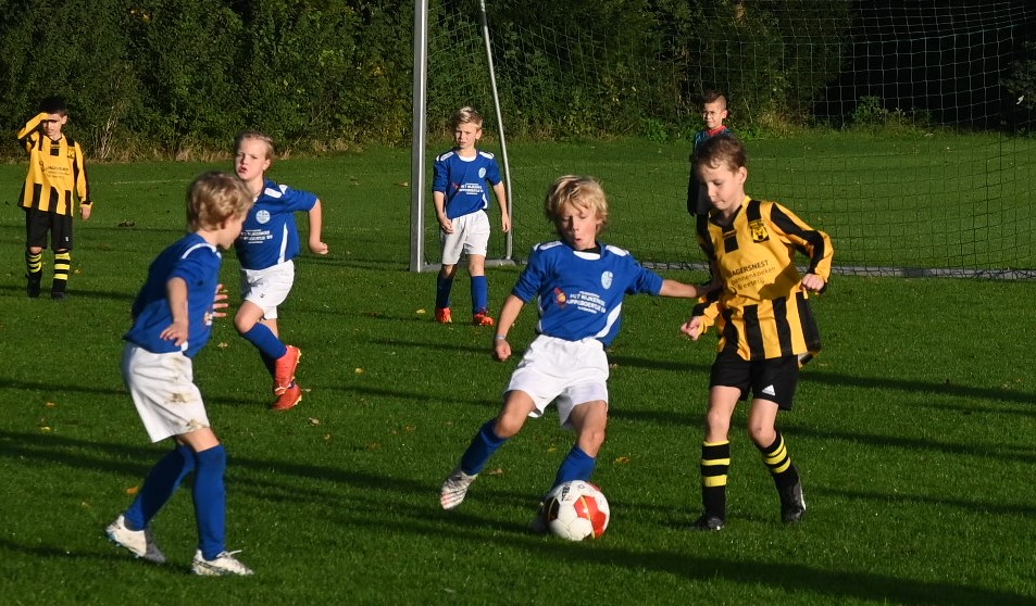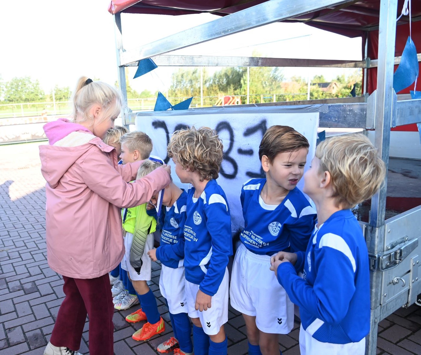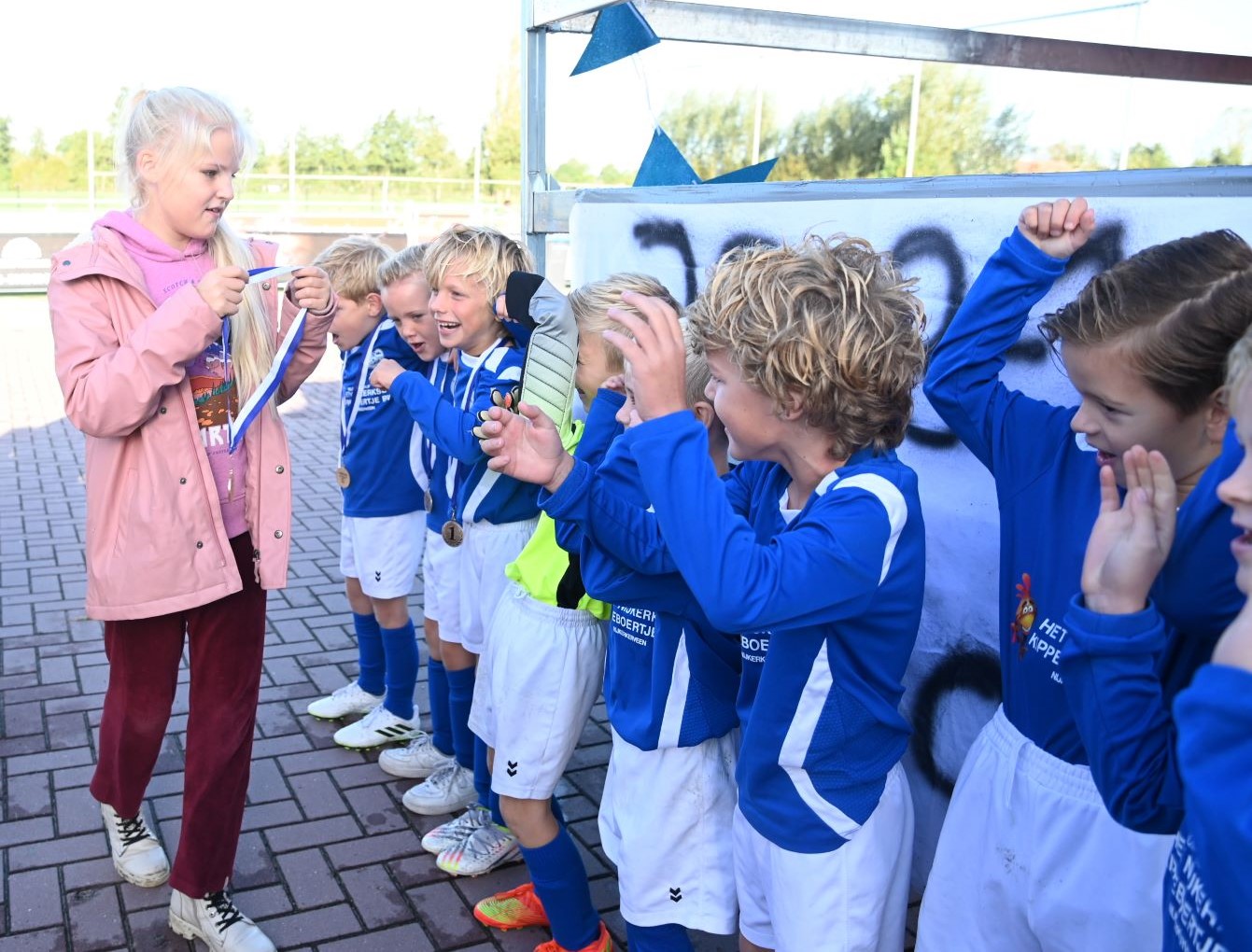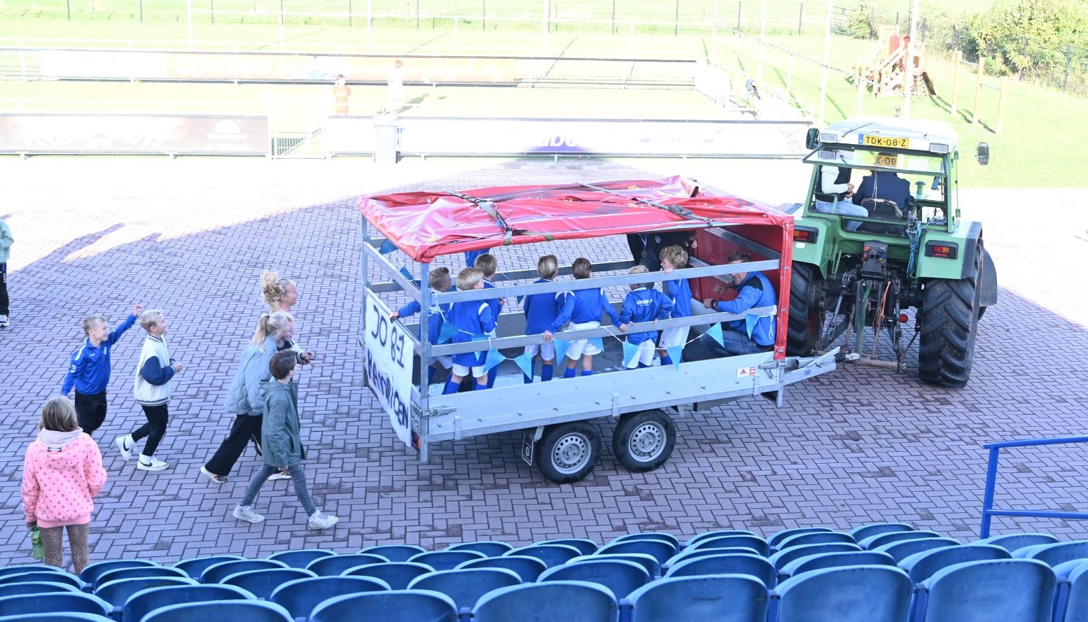 Wat een team. Veensche Boys JO8-1 is zaterdag 14 oktober al kampioen geworden door alles en iedereen te verslaan. Het afgelopen seizoen was een winst van 6-1 nog het minste resultaat. Het kampioenschap vond plaats in Ermelo waar de plaatselijke DVS moest worden verslagen. De tussenstand van 1-2 gaf aanvankelijk nog geen reden tot feestvreugde, maar nadien werd met liefst 1-14 gewonnen. In Nijkerkerveen aangekomen ontvingen de spelers een medaille, blauwwitte rookpotten en een rit op de wagen door het dorp. Foto Kees van den Heuvel
