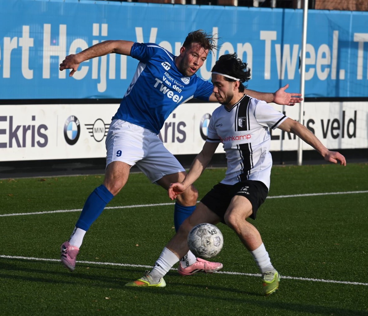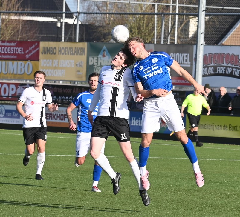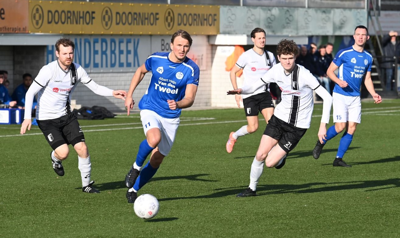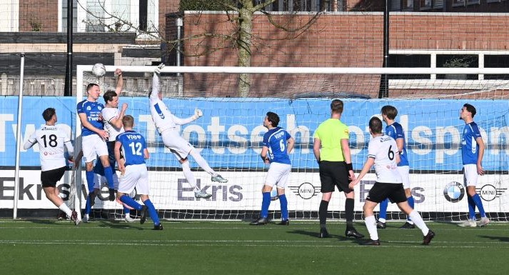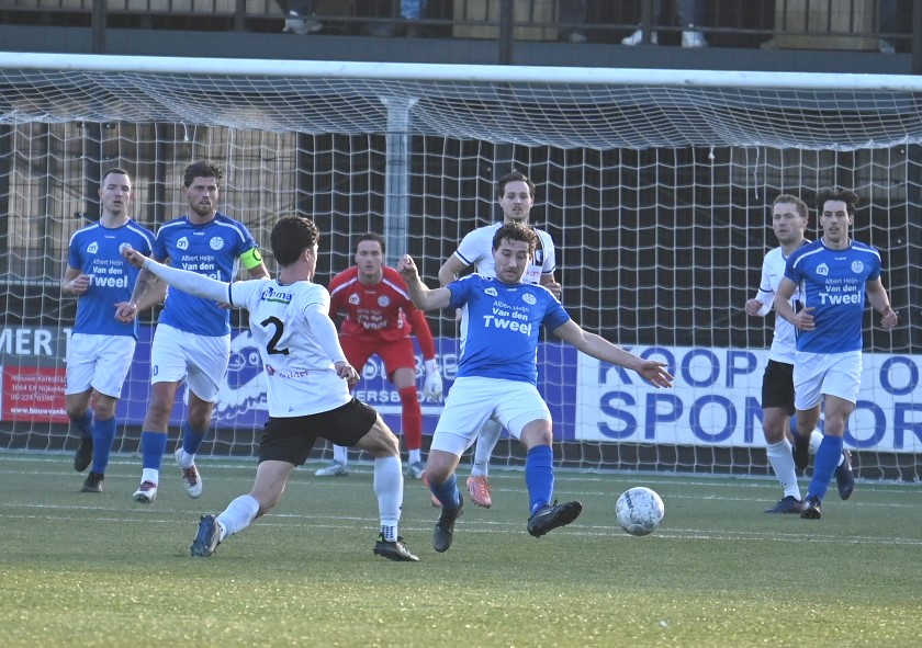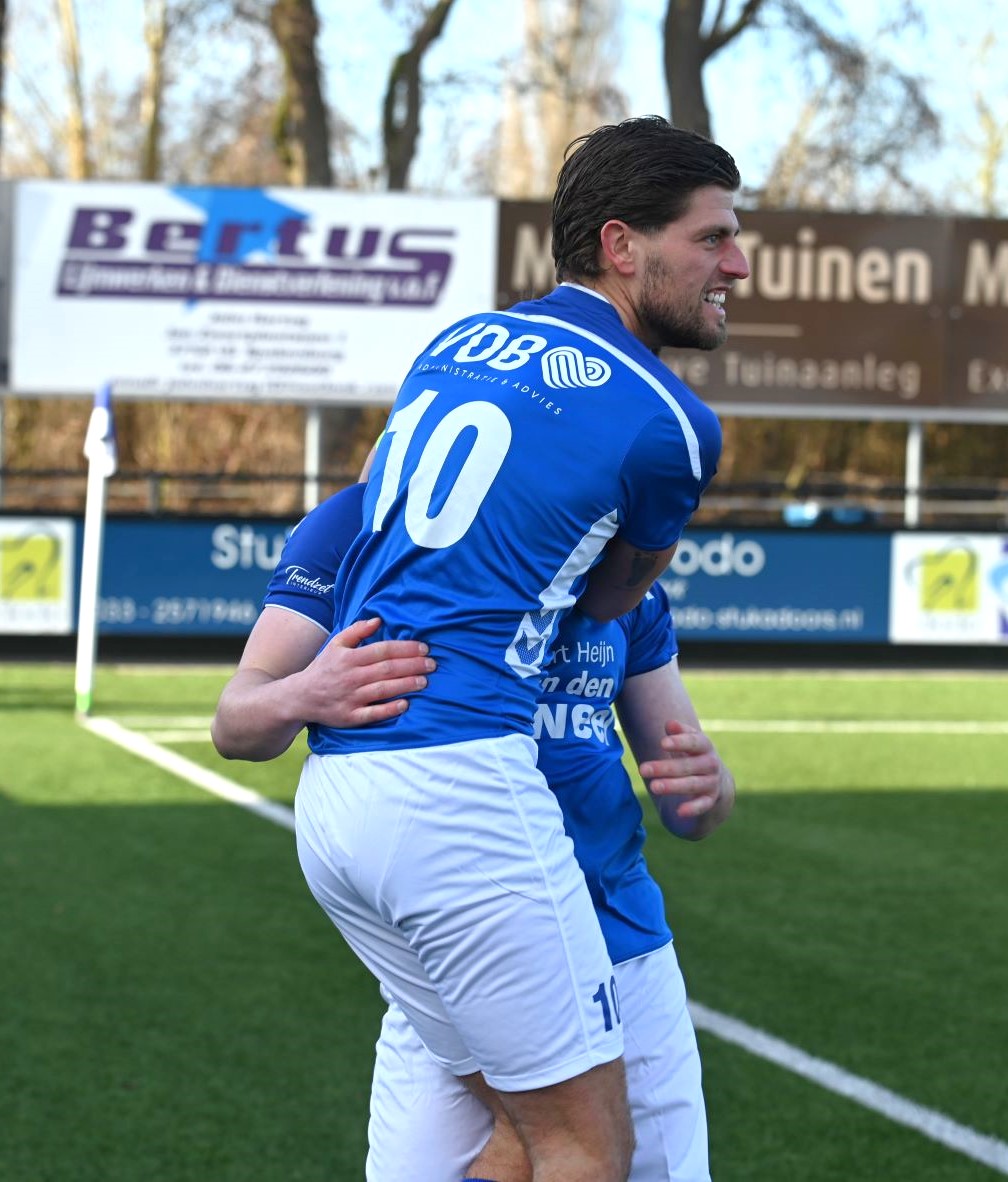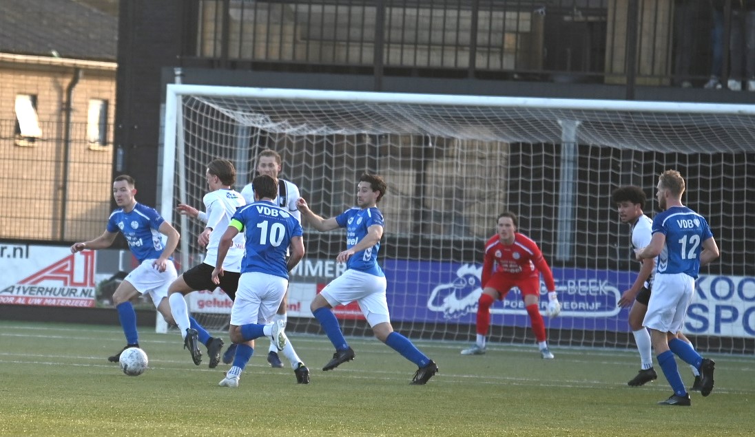 Explosief was de start van de Blauwe Helden. Al na vijftig seconden drukte Veensche Boys haar stempel op het spel en lag de bal in het net. Yannick Bouw schoof de voortreffelijke voorzet van Michel Goossensen magistraal in. En als ze even hadden doorgedrukt had Veensche Boys zomaar de marge kunnen vergroten. Berkum leek te worden opgerold. Met name op de linksback lagen daar de problemen en de trainer van Berkum greep snel in met een wissel (Reza Hosseini verving Jorben Nieuwenhuis). Berkum kreeg weer wat lucht en prompt werd de gelijkmaker gescoord via Sam van den Anker. De schrik was groot bij de Boys maar de aanvallende impulsen werd snel daarop hervat, met nog een vrije schotkans van Mark de Graaf. Het schot werd echter gekeerd door de keeper van Berkum. Ook na rust was het Veensche Boys dat de meeste aanspraak had op de winst. Kansen van Corné Parol, Yannick Bouw en Laurens de Korte gingen er net niet in. En dus was er sprake van een puntendeling. Berkum blijft koploper, maar het reële gevaar komt niet van boven maar van onder de degradatiestreep. Alle clubs onder Veensche Boys wisten te winnen en kwamen dichterbij. Foto en bron Kees van den Heuvel