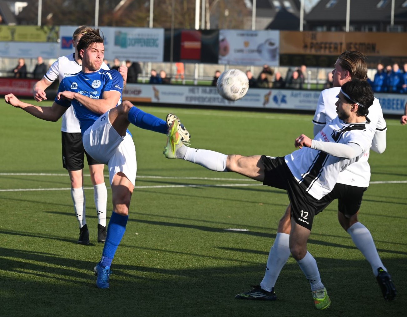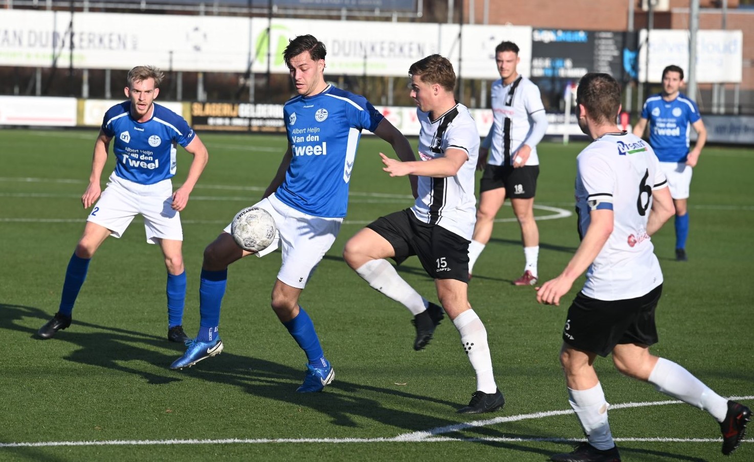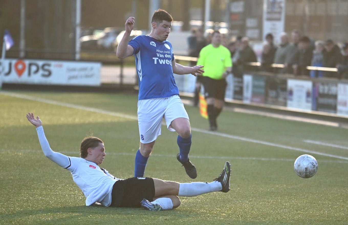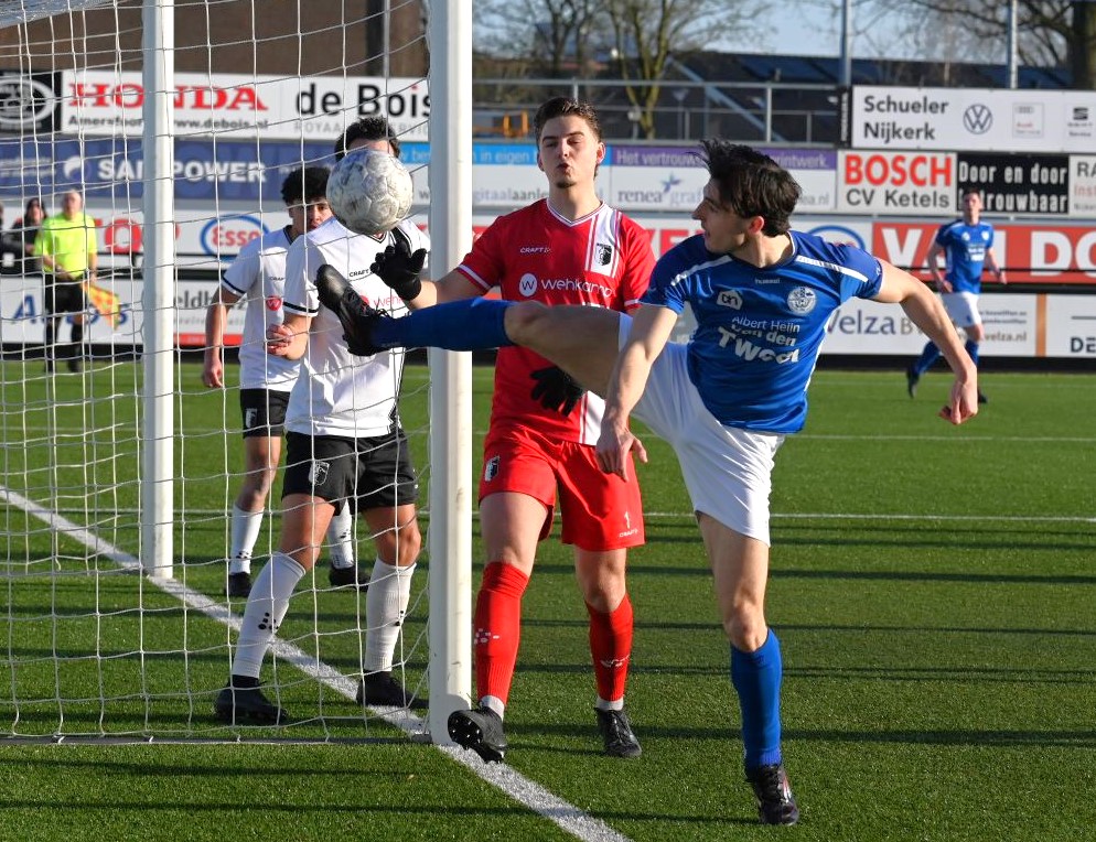 Explosief was de start van de Blauwe Helden. Al na vijftig seconden drukte Veensche Boys haar stempel op het spel en lag de bal in het net. Yannick Bouw schoof de voortreffelijke voorzet van Michel Goossensen magistraal in. En als ze even hadden doorgedrukt had Veensche Boys zomaar de marge kunnen vergroten. Berkum leek te worden opgerold. Met name op de linksback lagen daar de problemen en de trainer van Berkum greep snel in met een wissel (Reza Hosseini verving Jorben Nieuwenhuis). Berkum kreeg weer wat lucht en prompt werd de gelijkmaker gescoord via Sam van den Anker. De schrik was groot bij de Boys maar de aanvallende impulsen werd snel daarop hervat, met nog een vrije schotkans van Mark de Graaf. Het schot werd echter gekeerd door de keeper van Berkum. Ook na rust was het Veensche Boys dat de meeste aanspraak had op de winst. Kansen van Corné Parol, Yannick Bouw en Laurens de Korte gingen er net niet in. En dus was er sprake van een puntendeling. Berkum blijft koploper, maar het reële gevaar komt niet van boven maar van onder de degradatiestreep. Alle clubs onder Veensche Boys wisten te winnen en kwamen dichterbij. Foto en bron Kees van den Heuvel