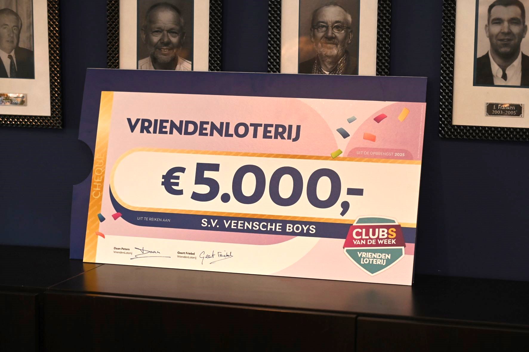 Goed nieuws van de Vriendenloterij. Voetbalvereniging Veensche Boys had zich aangemeld voor het project “Club van de Week” en Veensche Boys was uitgekozen als een van de gelukkige winnaars. Je kunt je hiervoor aanmelden, omdat een aantal leden via Veensche Boys deelneemt aan de Vriendenloterij. Meespelen levert niet alleen een mooie bijdrage per lot op, maar ook deelname aan dit soort interessante projecten. Er was onder meer een bijdrage gevraagd voor het verduurzamen van het sportcomplex, uitbreiden van de koelruimte en de aanschaf van materialen in het algemeen. Op 5 november jl. werd een delegatie van Veensche Boys uitgenodigd om tijdens de Nationale Sport Vakbeurs de cheque in ontvangst te nemen. Het werd een prachtige cheque van € 5.000,00, die afgelopen zaterdag is getoond in de bestuurskamer/businesshome in de rust van de competitiewedstrijd van Veensche Boys tegen DTS ’35. Veensche Boys dankt de Vriendloterij hierbij nogmaals voor dit mooie bedrag. Foto Kees van den Heuvel