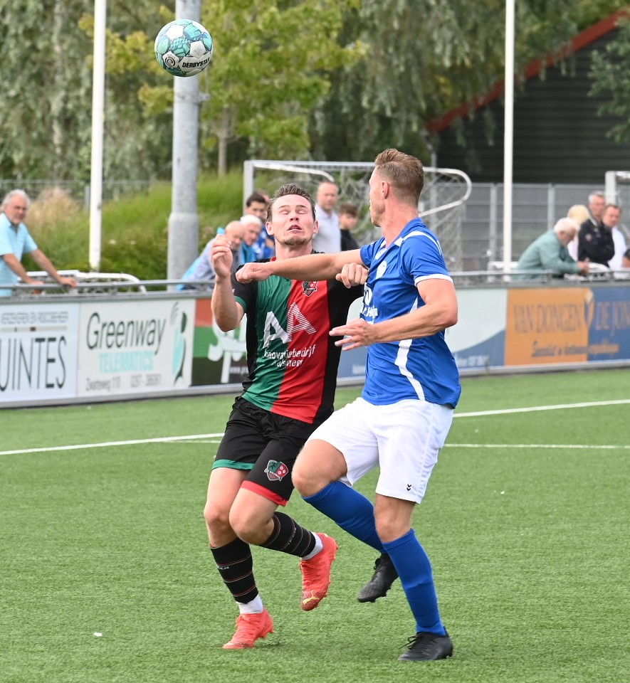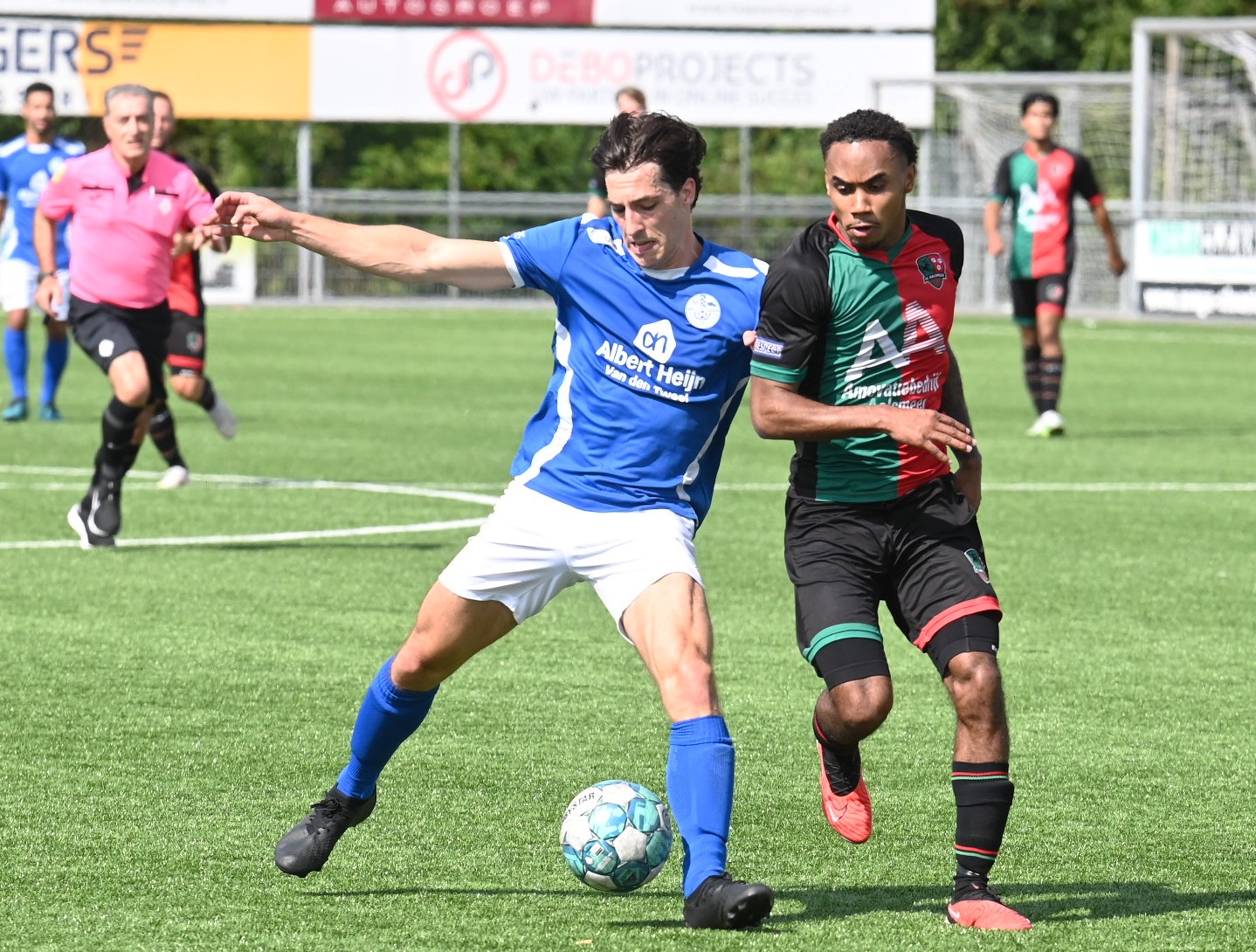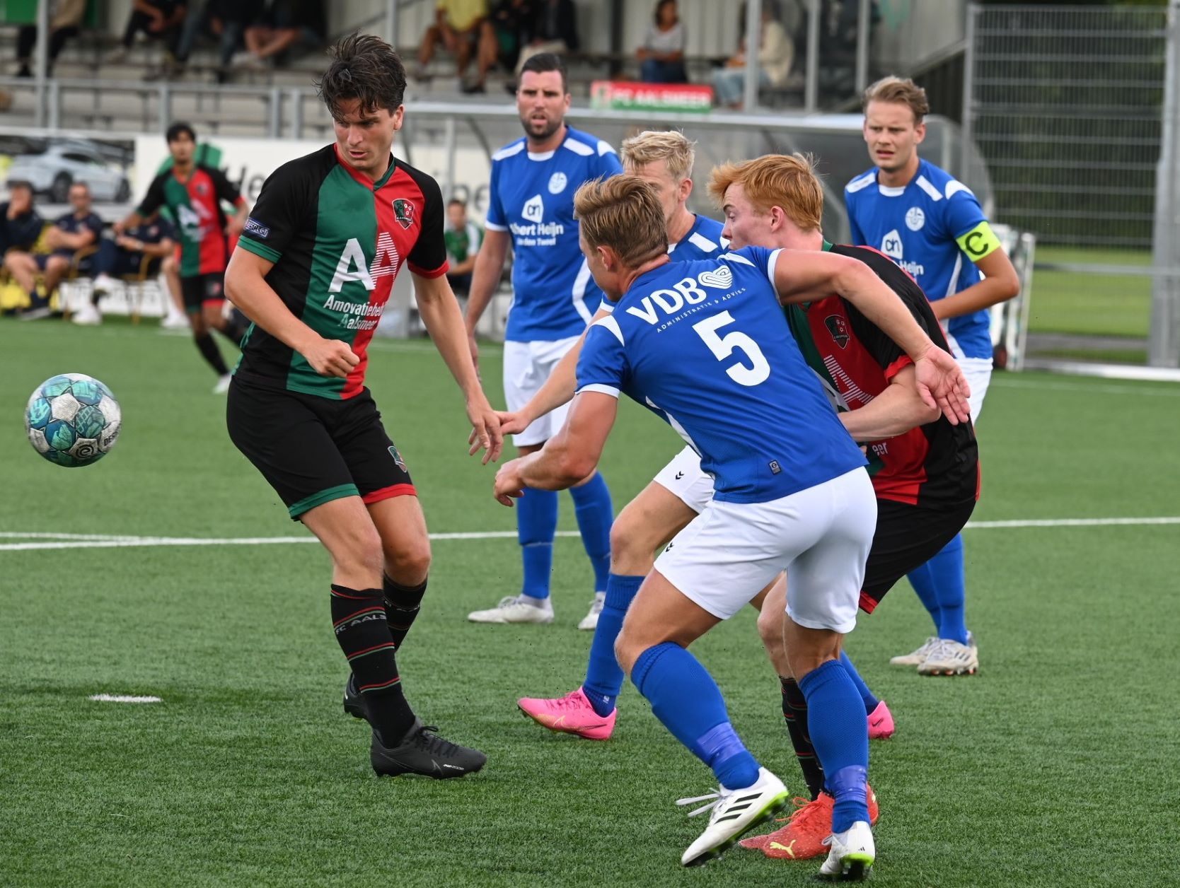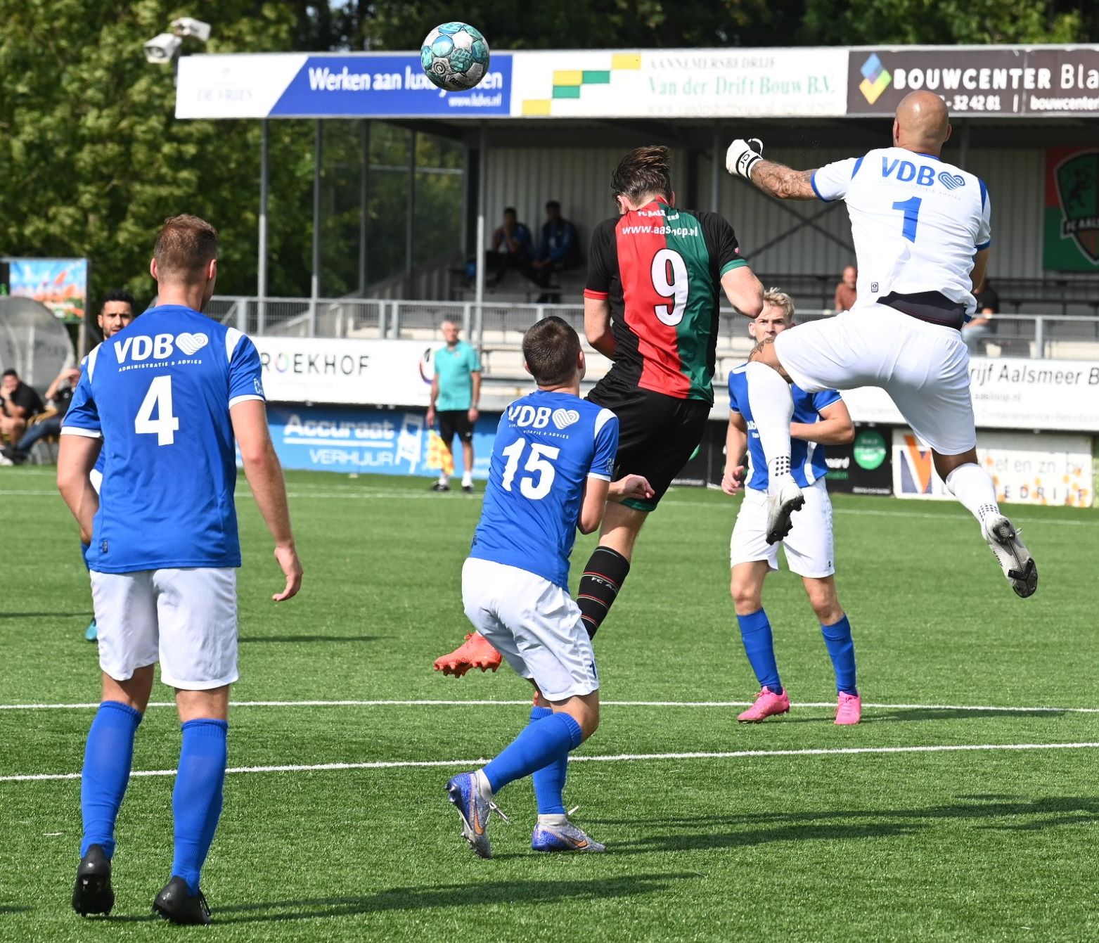 Veensche Boys heeft in haar oefenperiode weer flink toegeslagen. Op bezoek bij FC Aalsmeer werd zaterdag 26 augustus met 2-4 van de gastheren gewonnen. Aanvankelijk kwam FC Aalsmeer via een penalty van Luke Vahle aan kop, maar daarna sloeg Veensche Boys razendsnel toe. Het werd in luttele momenten 1-4 dankzij goals van aanvoerder Nico van den Brom, spits Corné Parol en de vleugelaanvallers Julian Buitenhuis en Tom van Donselaar. Het is dat de keeper van Aalsmeer een sta-in-de-weg bleek, maar anders was de score nog verder opgelopen. In de tweede helft was Veensche Boys alleen nog de eerste tien minuten angstvallig dichtbij de goal van de tegenstander, maar FC Aalsmeer dicteerde daarna het spel. Opnieuw door een penalty van Luke Vahle, na een lichte overtreding van Mauro Peters in het strafschopgebied, wist FC Aalsmeer de schade nog enigszins te beperken. Diezelfde Vahle ging later nog geblesseerd aan zijn rug van het veld. Foto Kees van den Heuvel