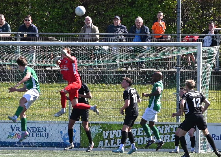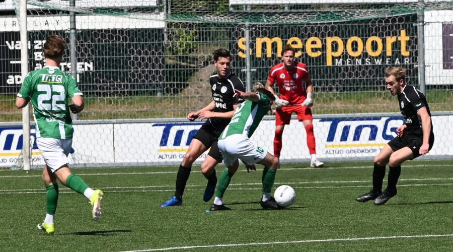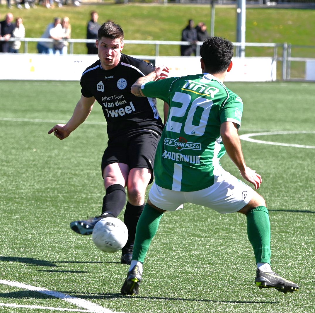 Veensche Boys heeft zaterdagmiddag 25 april met 2-1 verloren van VVOG Harderwijk. Hoewel de ploeg van trainer Jeroen Peters in de tweede helft een indrukwekkende veerkracht toonde en de gastheren volledig met de rug tegen de muur zette, bleek de schade uit de eerste helft niet meer te repareren. Een bewogen slotfase, inclusief een afgekeurde wereldgoal en rode kaarten, liet de Blauwe Helden met lege handen achter. De Boys begonnen nog hoopvol, maar na de eerste tien minuten nam VVOG het heft in handen. De Nijkerkerveense defensie had zichtbaar moeite met het Harderwijkse combinatievoetbal. In de 15e minuut opende Daniël van Warven de score namens de thuisploeg. Niet veel later profiteerde diezelfde Van Warven van balverlies achterin bij de Boys en tekende koelbloedig voor de 2-0. Vlak voor rust lieten de Boys de eerste tekenen van herstel zien met een kopbal die rakelings overging en een kans waarbij buitenspel werd geconstateerd, maar de kleedkamer werd opgezocht met een bittere 2-0 achterstand.