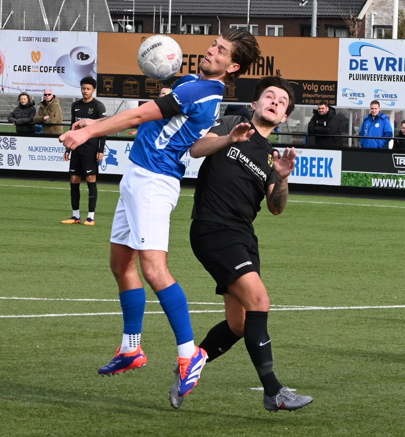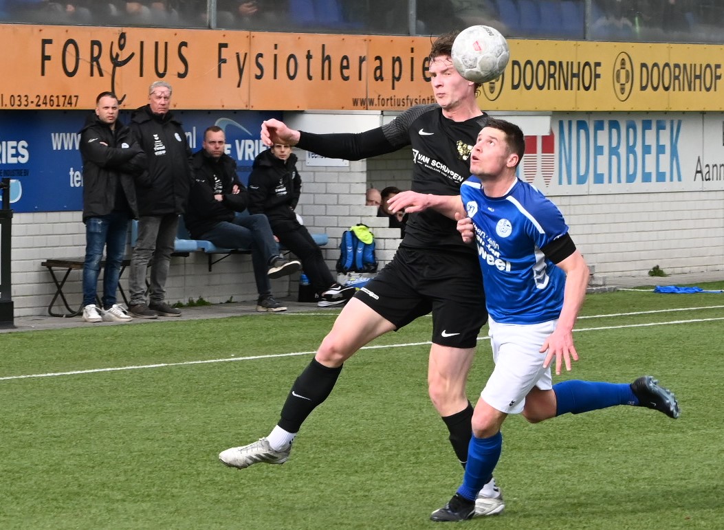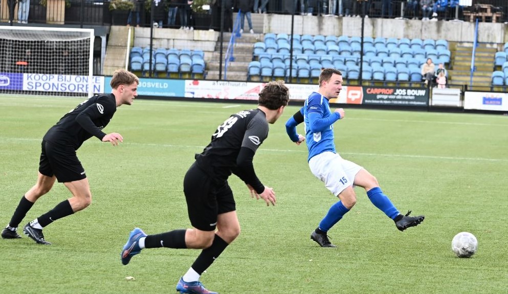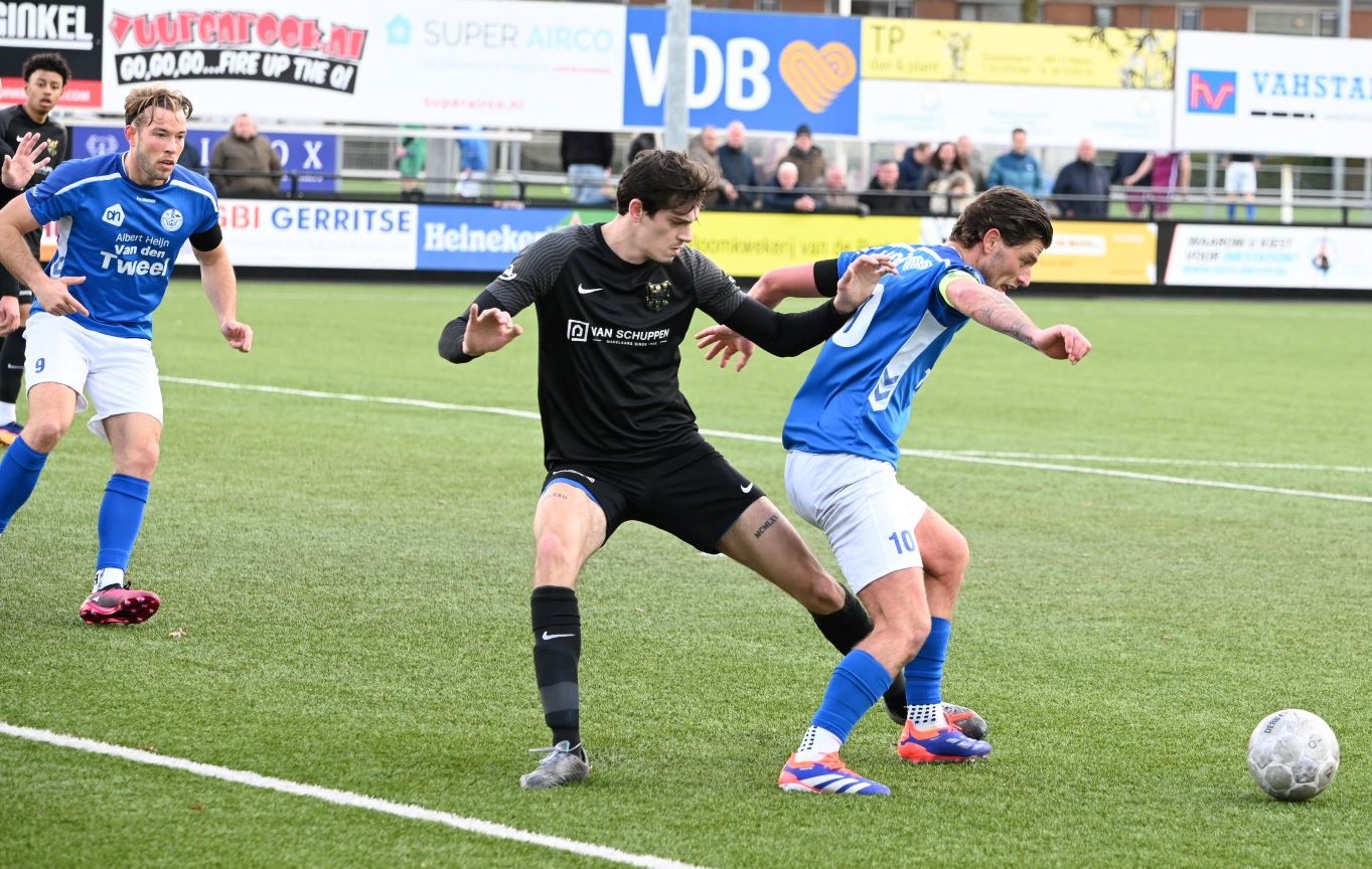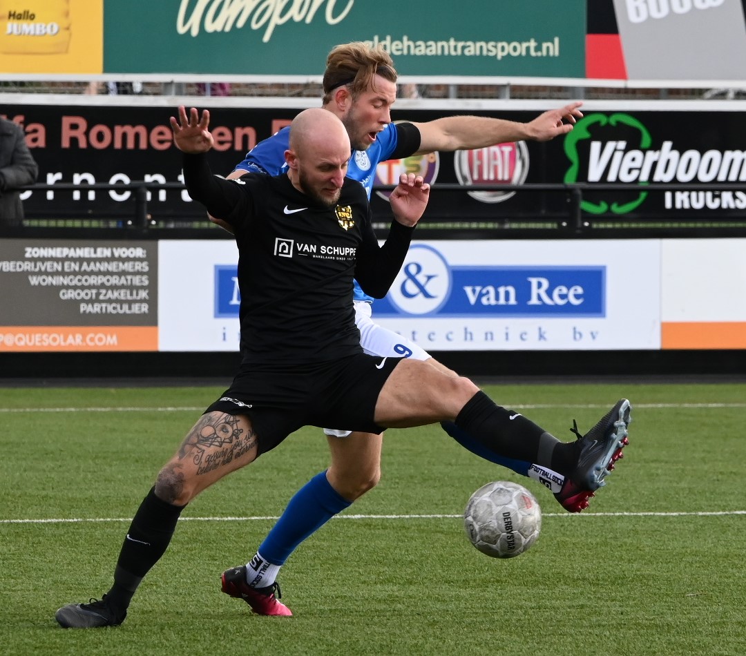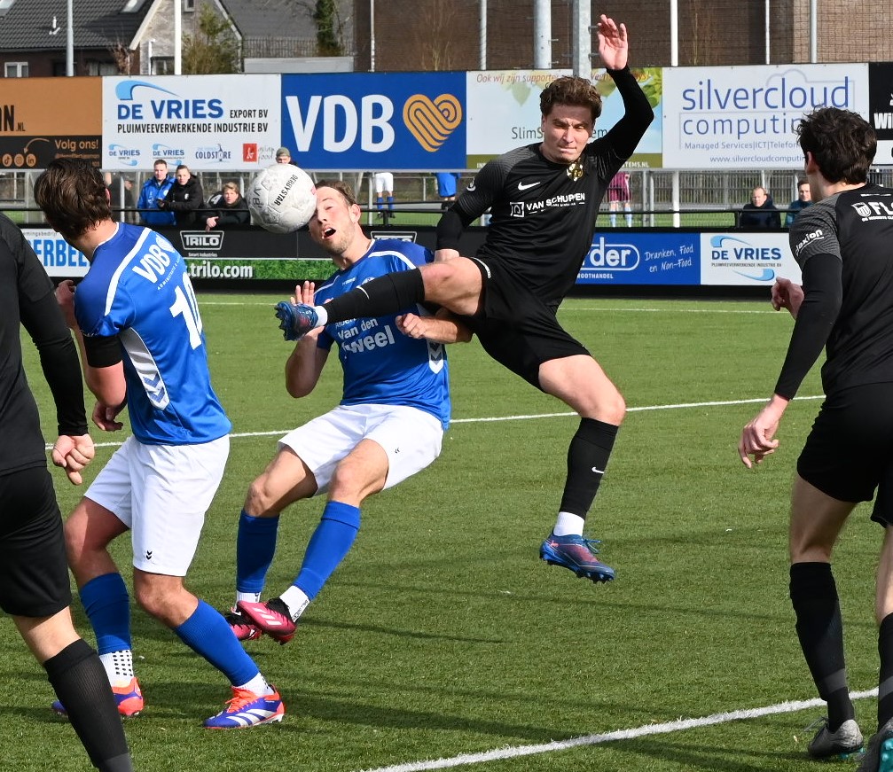 De wedstrijd kende een tactisch steekspel waarbij Veensche Boys aandrong en VRC probeerde voetballend onder de druk uit te komen. Dit leidde halverwege de eerste helft tot een voorsprong voor de gasten. Na een mooie voetballende aanval van de Veenendalers werd een overtreding begaan in het strafschopgebied van Veensche Boys, waarna Viggo Koeleman koelbloedig bleef en de 0-1 binnenschoot vanaf de stip. Later waren er nog twee grote kansen voor VRC maar doelman Wessel Bosman wist in een paar seconden tijd tweemaal daadkrachtig op te treden. Voor het overige was het Veensche Boys dat de klok sloeg. De gelijkmaker kon dan ook niet uitblijven. Na een overtreding op Dave Knikker mocht specialist Michel Goossensen op slag van rust aanleggen voor een vrije trap. Hij faalde niet en schoot de 1-1 tegen de touwen, met name omdat de muur van VRC niet goed stond. In de tweede helft was het vooral eenrichtingsverkeer van de club uit Nijkerkerveen. Veensche Boys zette aan en maakte het de gasten lastig met een fysieke speelwijze en het hanteren van de lange bal. Het meest dichtbij was Corne Parol (nog licht aangetikt door Mark de Graaf) met een bal op de paal. Ondanks de druk van Veensche Boys in de slotfase hield de defensie van VRC stand. Foto Kees van den Heuvel