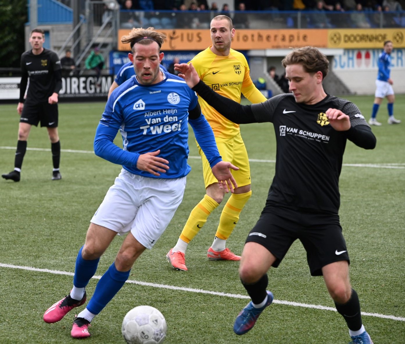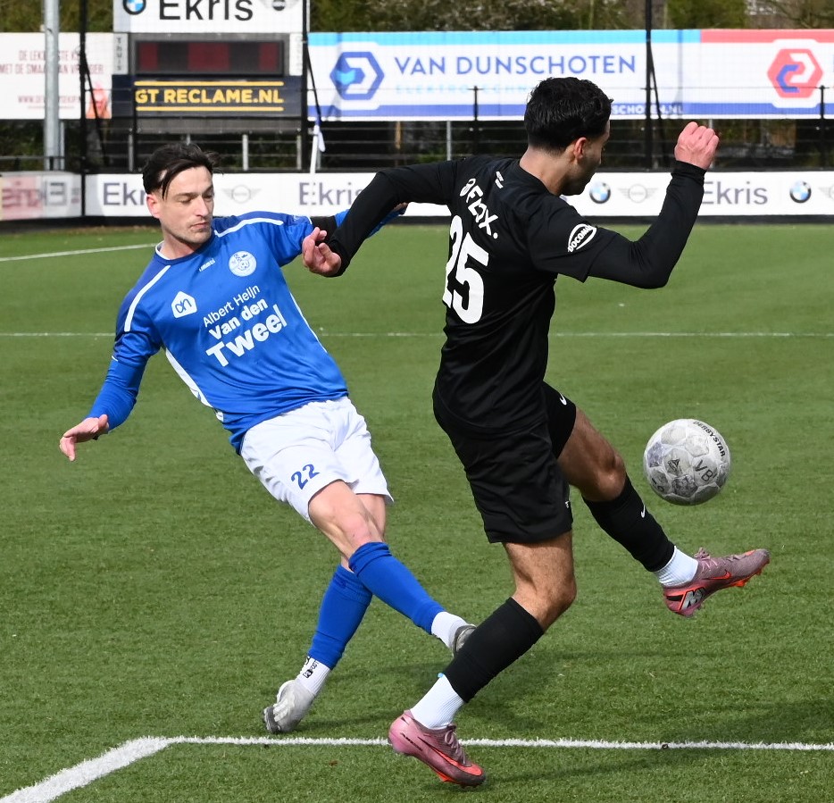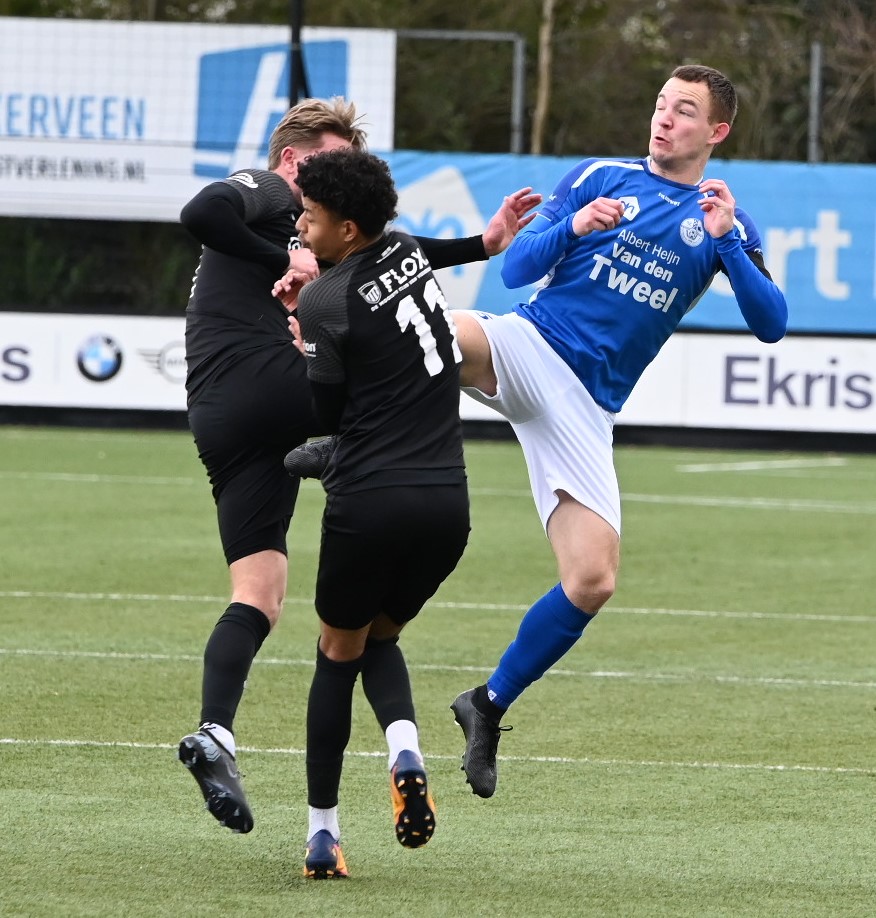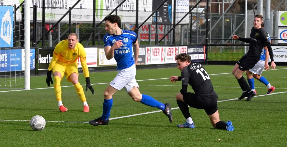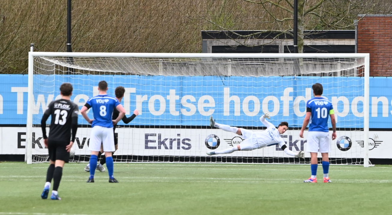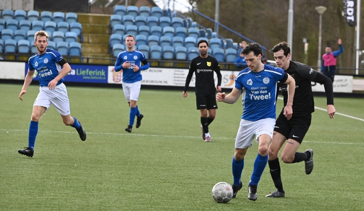 De wedstrijd kende een tactisch steekspel waarbij Veensche Boys aandrong en VRC probeerde voetballend onder de druk uit te komen. Dit leidde halverwege de eerste helft tot een voorsprong voor de gasten. Na een mooie voetballende aanval van de Veenendalers werd een overtreding begaan in het strafschopgebied van Veensche Boys, waarna Viggo Koeleman koelbloedig bleef en de 0-1 binnenschoot vanaf de stip. Later waren er nog twee grote kansen voor VRC maar doelman Wessel Bosman wist in een paar seconden tijd tweemaal daadkrachtig op te treden. Voor het overige was het Veensche Boys dat de klok sloeg. De gelijkmaker kon dan ook niet uitblijven. Na een overtreding op Dave Knikker mocht specialist Michel Goossensen op slag van rust aanleggen voor een vrije trap. Hij faalde niet en schoot de 1-1 tegen de touwen, met name omdat de muur van VRC niet goed stond. In de tweede helft was het vooral eenrichtingsverkeer van de club uit Nijkerkerveen. Veensche Boys zette aan en maakte het de gasten lastig met een fysieke speelwijze en het hanteren van de lange bal. Het meest dichtbij was Corne Parol (nog licht aangetikt door Mark de Graaf) met een bal op de paal. Ondanks de druk van Veensche Boys in de slotfase hield de defensie van VRC stand. Foto Kees van den Heuvel