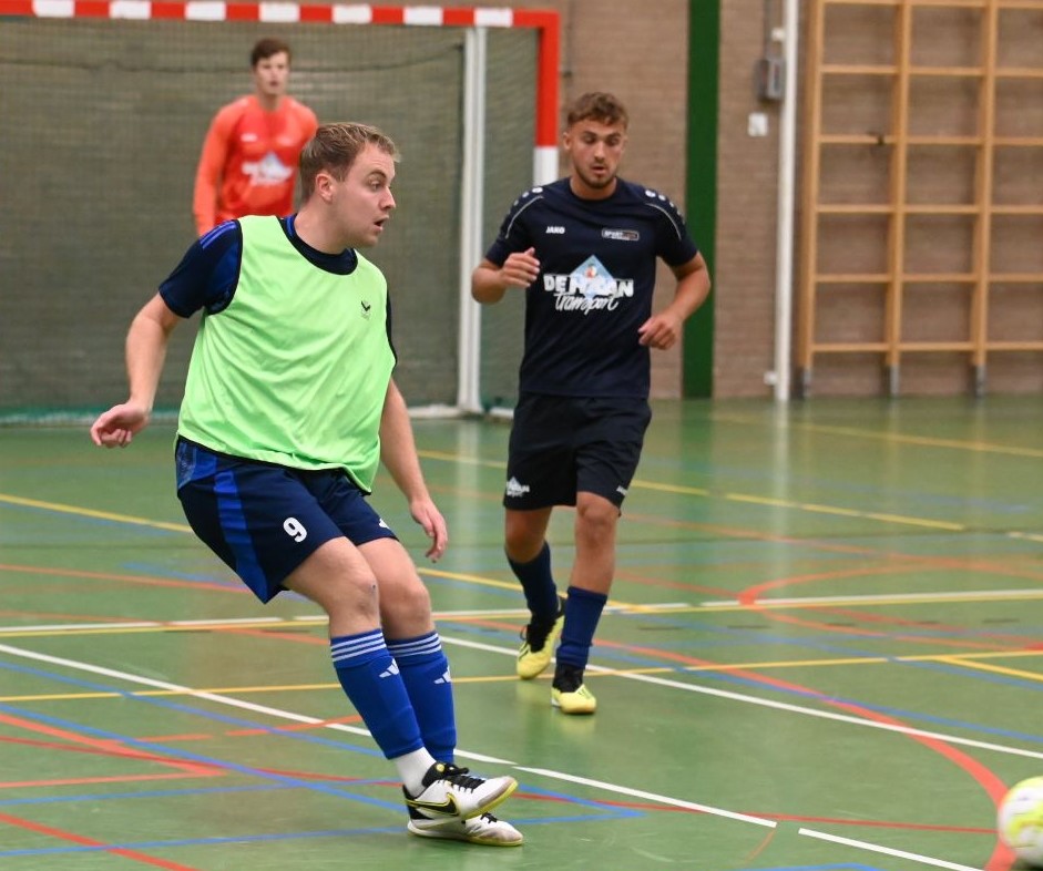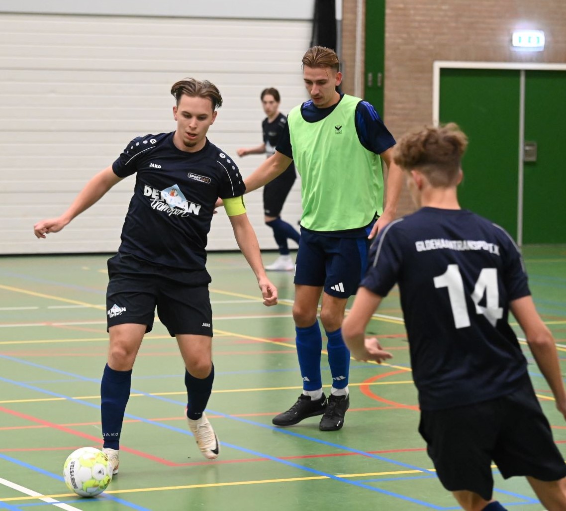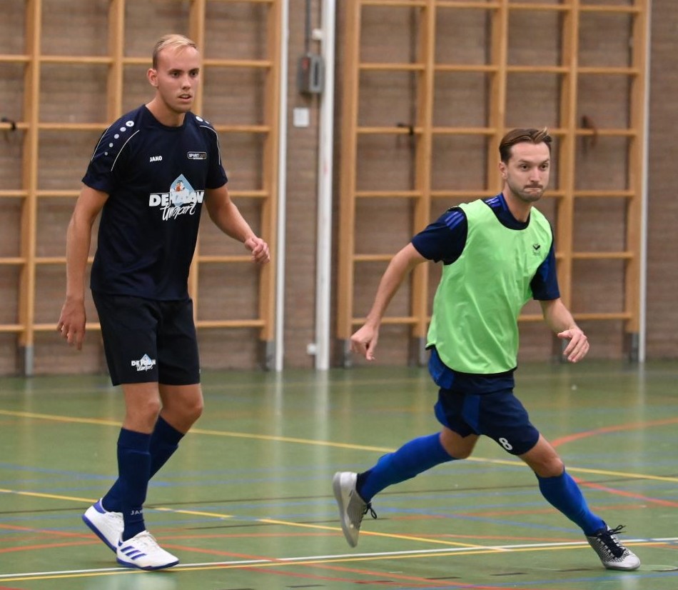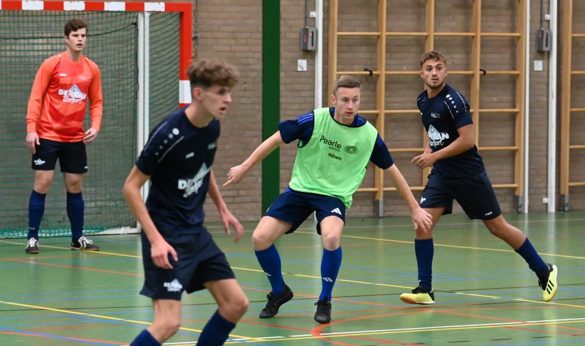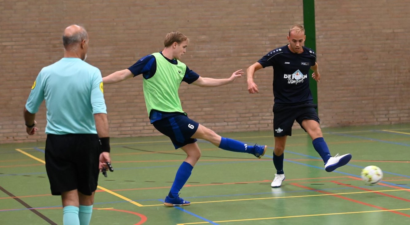 Het eerste team van zaalvoetbalvereniging Veensche Boys heeft de klapper in de hoofdklasse gewonnen van Watergoor. In het Nijkerkse treffen trokken de Blauwe Helden aan het langste eind. Het werd 0-1 in het voordeel van Veensche Boys. Die enige treffer werd gemaakt door Niek van Diermen. Dat werd uiteraard uitgebreid gevierd in sportcafé Watergoor. Foto Kees van den Heuvel