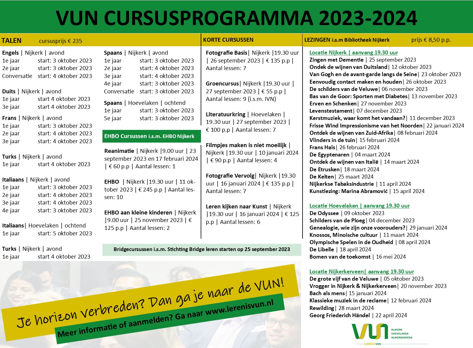 De stichting Volksuniversiteit Nijkerk (VUN) heeft weer een bijzonder uitgebreid activiteitenprogramma gepresenteerd. Dat varieert van taallessen tot fotografie, wijnkennis en groencursussen. Op deze lijst ontbreekt nog de Historische Lezing: Huize Hoevelaken (reprise) op 1 februari 2024 in Hoevelaken. Heeft u zin in één of meerdere activiteiten? Kijk dan op www.lerenisvun.nl