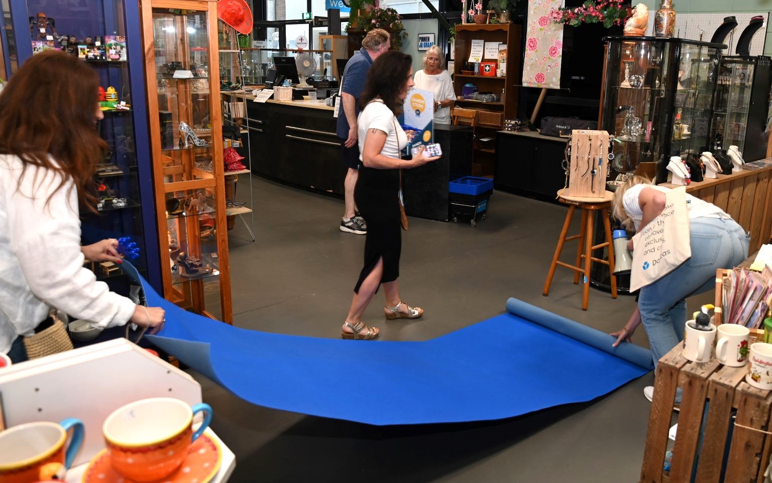Een vertegenwoordiging van de landelijke tak van Dorcas heeft donderdagmorgen de vrijwilligers van Dorcas Nijkerk verrast in verband met het 45-jarige bestaan van de hulporganisatie. Er werd een blauwe loper uitgerold en na een korte toespraak ontvingen alle medewerkers een button en aan de bedrijfsleider werd een doos vol chocolade uitgereikt. Dorcas staat bekend om de kringloopwinkel waar je tweedehands interieurartikelen, speelgoed, boeken en kleding kunt shoppen en waarbij de opbrengst bestemd is voor mensen in nood in Oost-Europa, Afrika en het Midden-Oosten. Het bezoek van de winkel in Nijkerk maakte onderdeel uit van de zogeheten Dorcas Dankjewel Dag, een dag waarop Dorcas iedereen bedankte voor zijn of haar bijdrage. Naast de winkel in Nijkerk werden ook bijna alle andere kringloopwinkels van Dorcas bezocht. Op het kantoor in Almere schreven medewerkers bedankkaartjes voor sponsors, donateurs en andere relaties. Ook was een groep medewerkers deze dag aan het bellen naar trouwe supporters, om hen te bedanken voor hun – vaak al jarenlange – steun. Foto Kees van den Heuvel