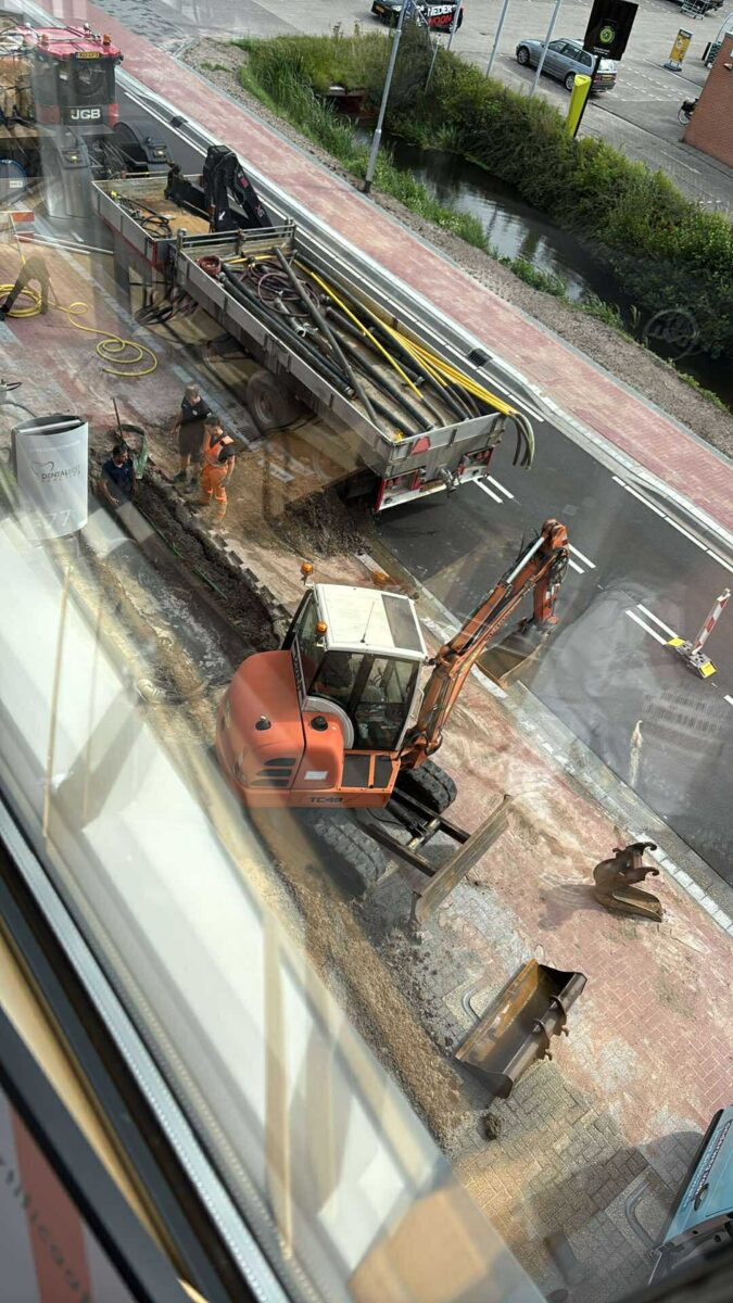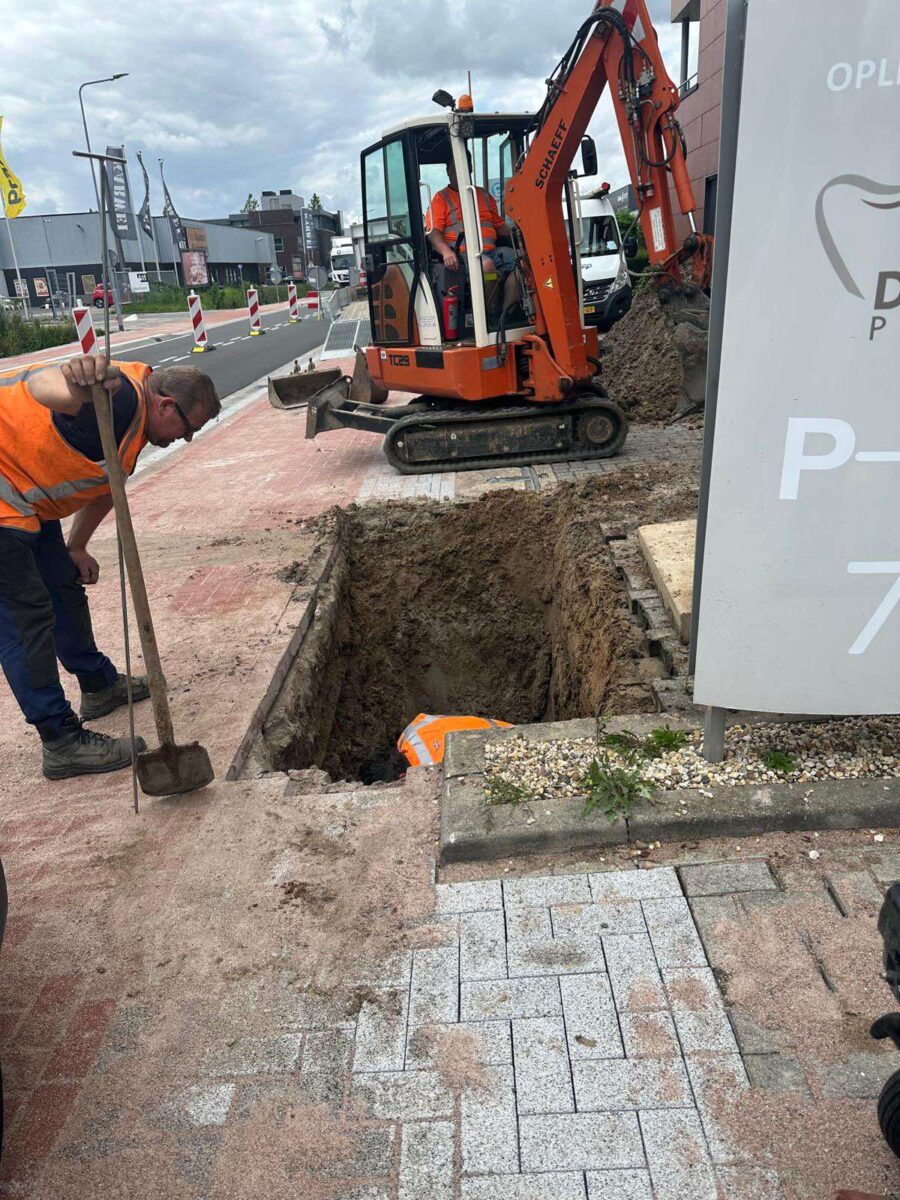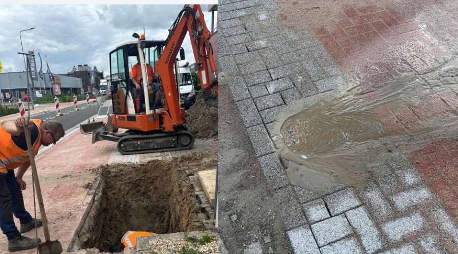 Op de Watergoorweg in Nijkerk is dinsdagmorgen 5 augustus de waterleiding gesprongen. Hierdoor zit een groot aantal bedrijven zonder water. Het repareren van de kapotte waterleiding gaat nog wel even duren, want de waterleiding zit bijna 2 meter onder het maaiveld. De aannemer schat in dat de werkzaamheden tot 21.00 uur gaan duren. De Watergoorweg is voor een deel vorige weken gerenoveerd. Tekst Kees van den Heuvel
