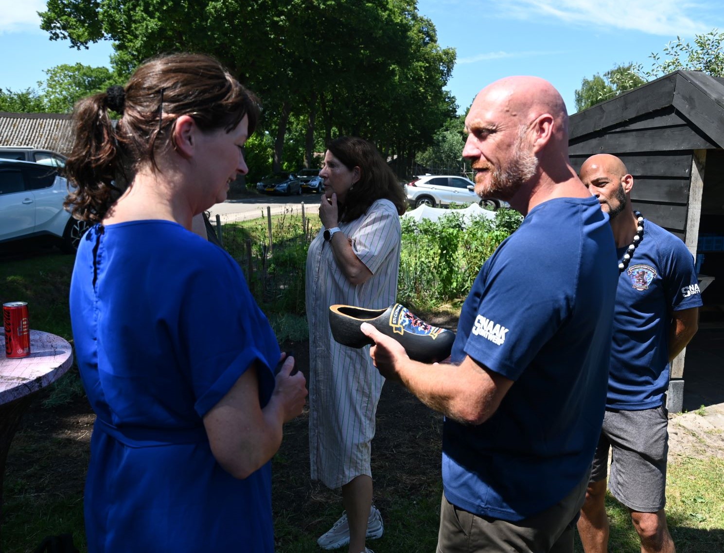 Wethouder Esther Heutink heeft maandagmiddag 30 juni een gele Invictus-bank onthuld bij het moestuinencomplex aan de Veenwal in Hoevelaken. Daarnaast is een perkje gemaakt waar witte anjers gaan groeien, de Hortus Invictus genoemd. Op de invictusbank kunnen veteranen, die hebben gediend voor het Nederlandse leger, in contact met lotgenoten treden. Wethouder Heutink: ,,Moge dit bankje een plek zijn waar verhalen worden gedeeld, hoop wordt gevoeld en heling kan plaatsvinden.” De wethouder sprak haar dank uit aan de militairen die hebben gediend namens Nederland. ,,Het is een plek van betekenis, een plek van herinnering en verbondenheid. Het is een veilige haven, een plek waar sport en beweging bijdragen aan herstel, fysiek en mentaal. Waar je weer kunt voelen: ik hoor erbij en ik doe er weer toe.’’ Bart van der Burg van Return to Base is mede-initiatiefnemer van het meubelstuk. Return to Base is dit jaar genomineerd voor de Witte Anjer Prijs. Foto Kees van den Heuvel