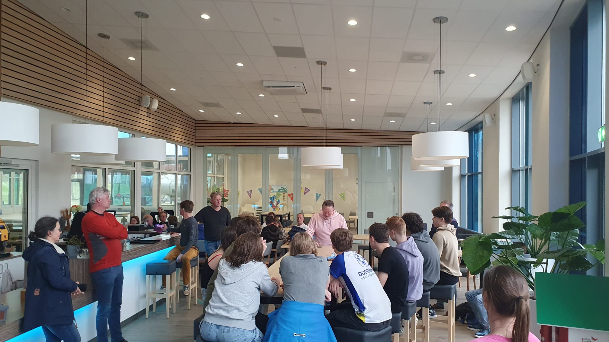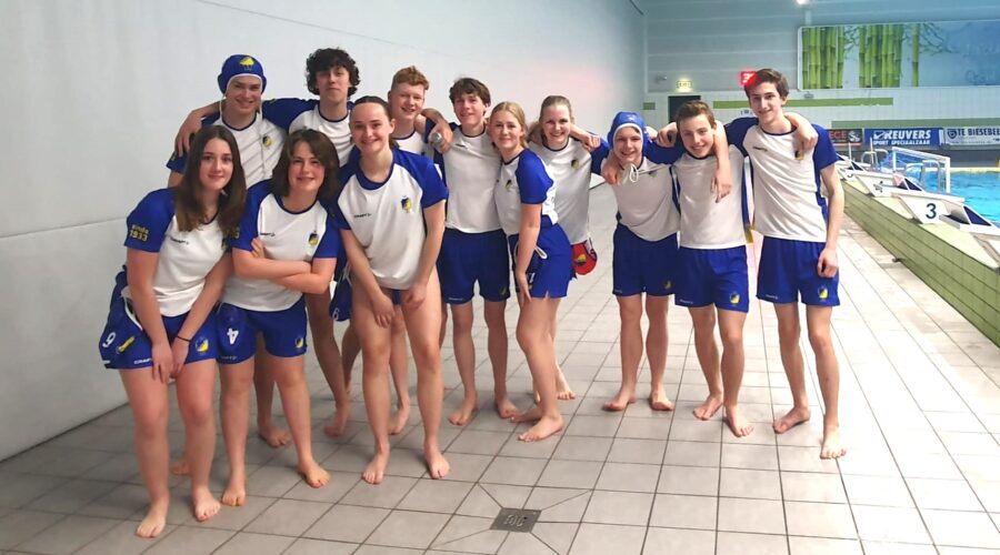 Zaterdag 22 april reisde Flevo waterpolo onder de 17 af naar Zwolle. Via de app werden ze nog toegesproken door hun coach Wouter. Onder de bezielende leiding van Henk Klok wonnen ze met maar liefst 2-13. Ze kwamen daarna in een limousine richting het Jaap van de Krolbad. Daar werden Lara, Christijn, Vlinder, Lisa Sebastiaan, Jan, Sofie, Guus, Branco, Hidde, Storm en Nora door voorzitter Henno Koelewijn gefeliciteerd en kregen ze een medaille. De voorzitter noemde ook Dennis die helaas niet bij de wedstrijd kon zijn maar het hele jaar een mooie bijdrage heeft geleverd aan het kampioensteam. De ontbrekende coaches Wouter en Roel werden genoemd en bedankt. Goos feliciteerde de kampioenen namens de waterpolo commissie. Foto Trudy Doornhof.