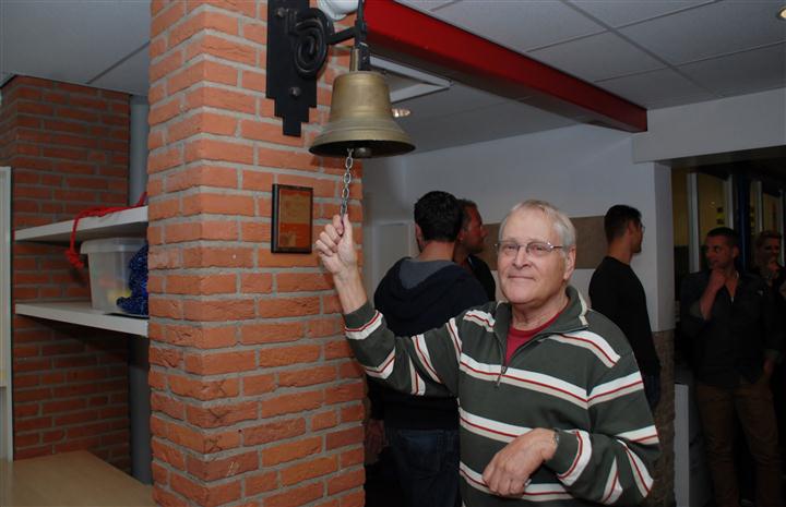 Toenmalig hoofd van de school Foppe Witzel bedient de oude schoolbel