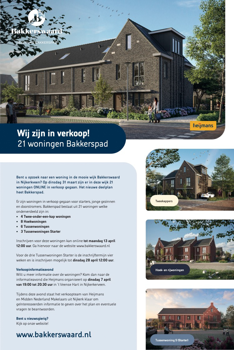 In de wijk Bakkerswaard in Nijkerkerveen zijn sinds maandag 31 maart 21 nieuwe woningen officieel in verkoop gegaan. Het betreft het nieuwe deelplan ‘Bakkerspad’, ontwikkeld door Heijmans.