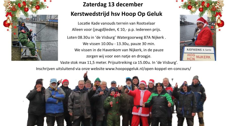 Op zaterdag 13 december organiseert hengelsportvereniging Hoop op Geluk een kerstwedstrijd op de locatie Kade, vanouds terrein Van Rootselaar. Het is alleen voor (jeugd)leden, € 10,- p.p. Iedereen prijs. Loten 8.30 uur in ‘de Visburg’ Watergoorweg 87A Nijkerk. Ze vissen 10.00u – 13.30u (pauze 30 min) in de Havenkom van Nijkerk. In de pauze zorgen zij voor een natje en droogje. Vaste stok max 11,5 meter. Prijsuitreiking ca 15.00u (in ‘de Visburg’). Inschrijven uitsluitend via de website www.hoopopgeluk.nl/open-koppel-en-concours/