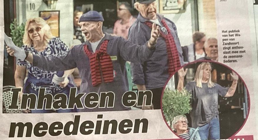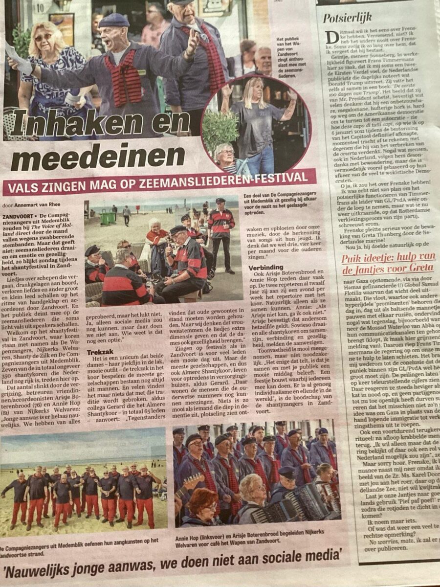 De Telegraaf heeft maandag 29 september een groot artikel in haar papieren krant staan over het shantyfestival in Zandvoort. Het optreden van het zeemanskoor Nijkerks Welvaren wordt hierin uitgebreid behandeld. De Nijkerkse mannen traden op bij café Het Wapen van Zandvoort met nog wat andere koren die met een uiteenlopend repertoire optredens ten gehore gaven.