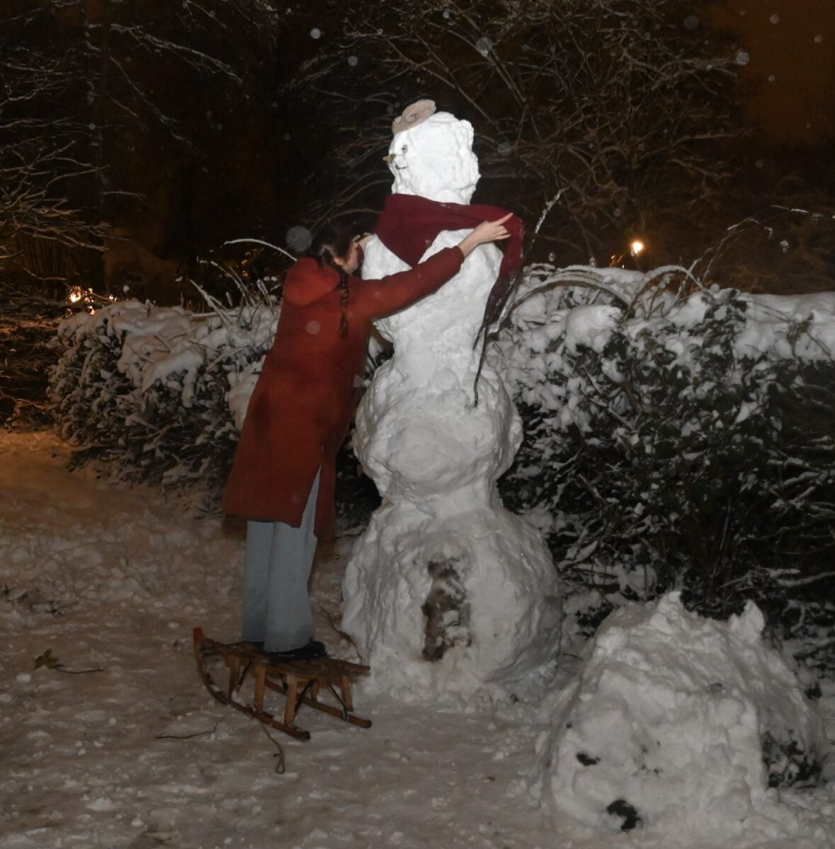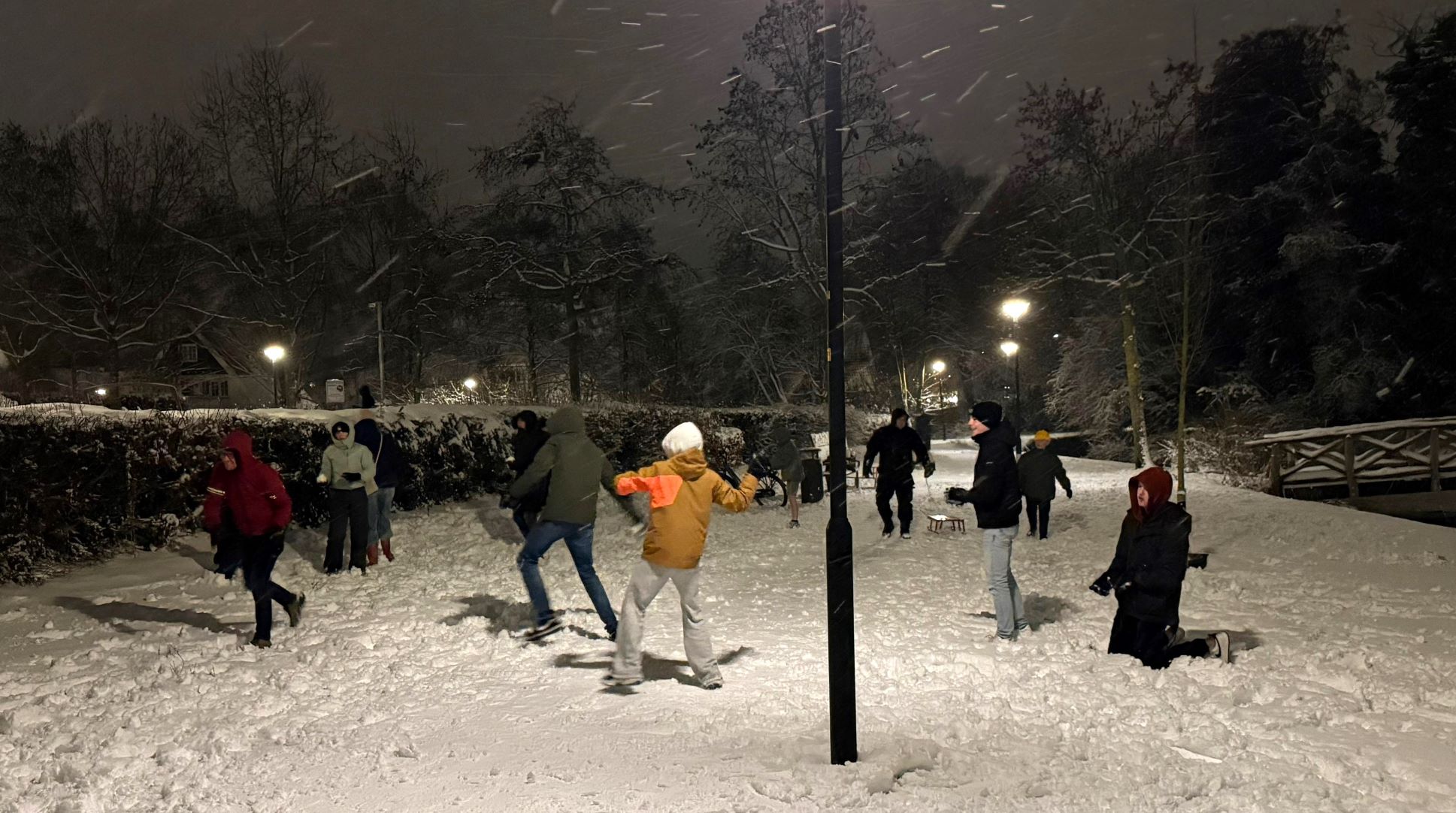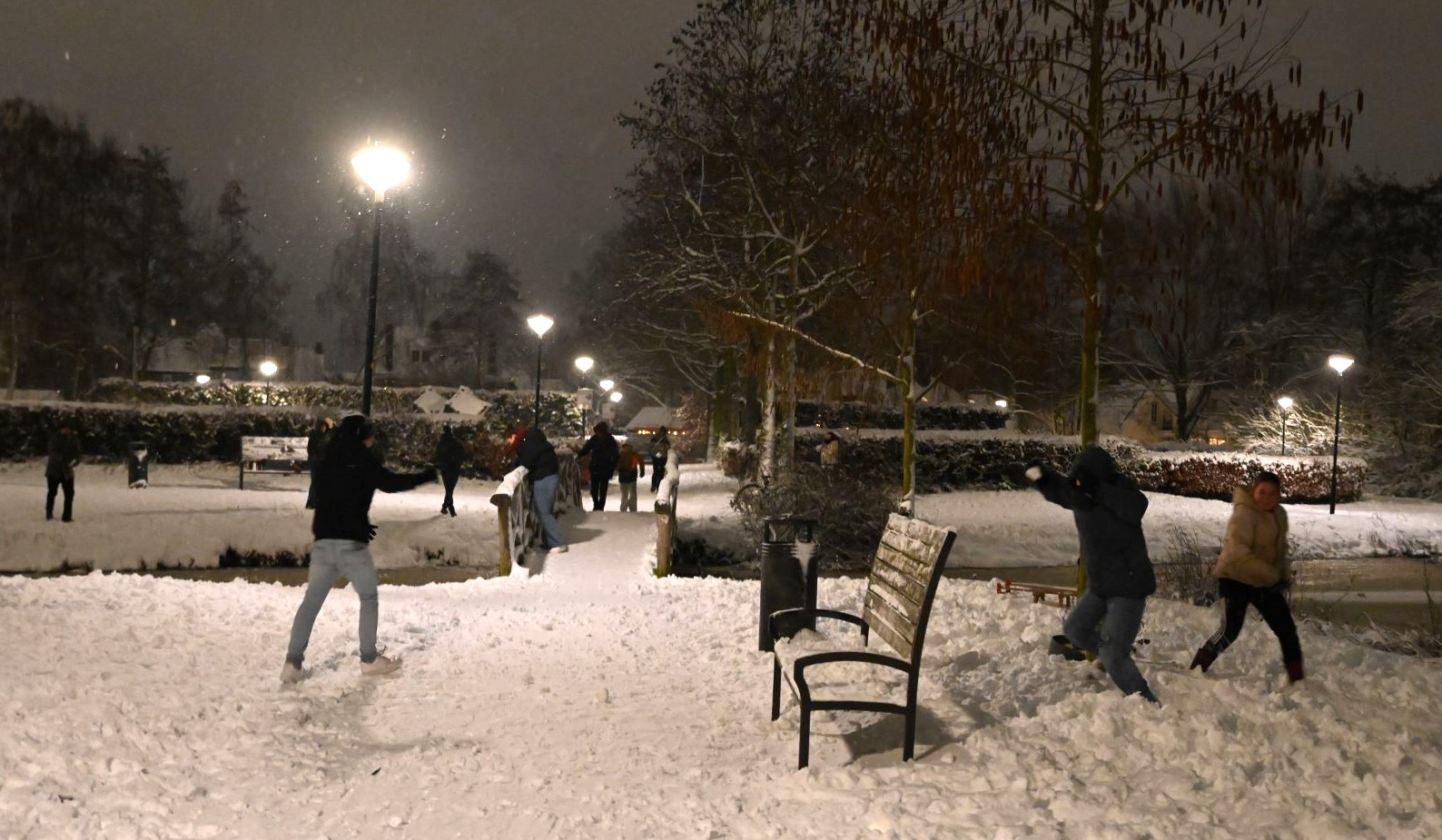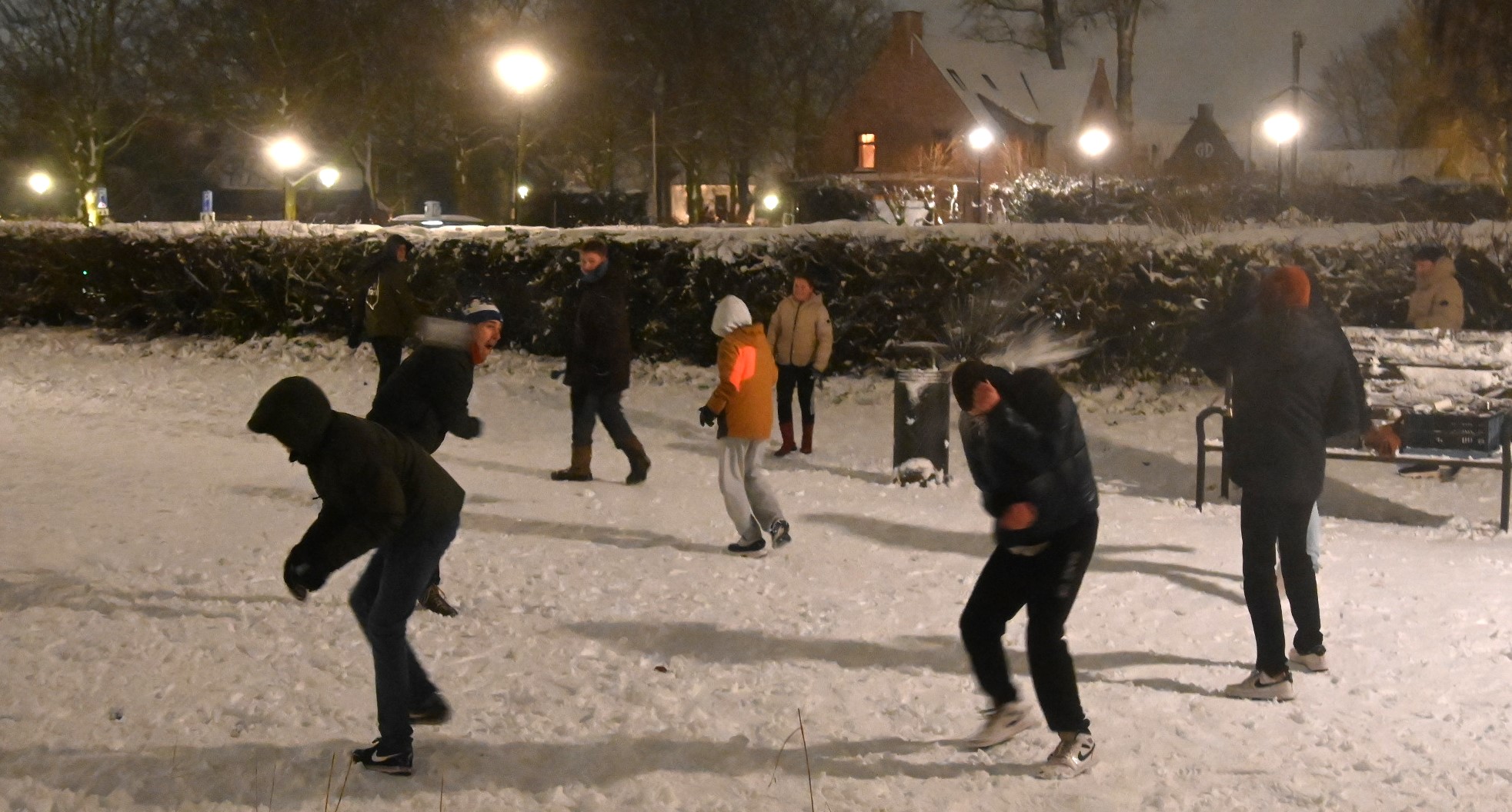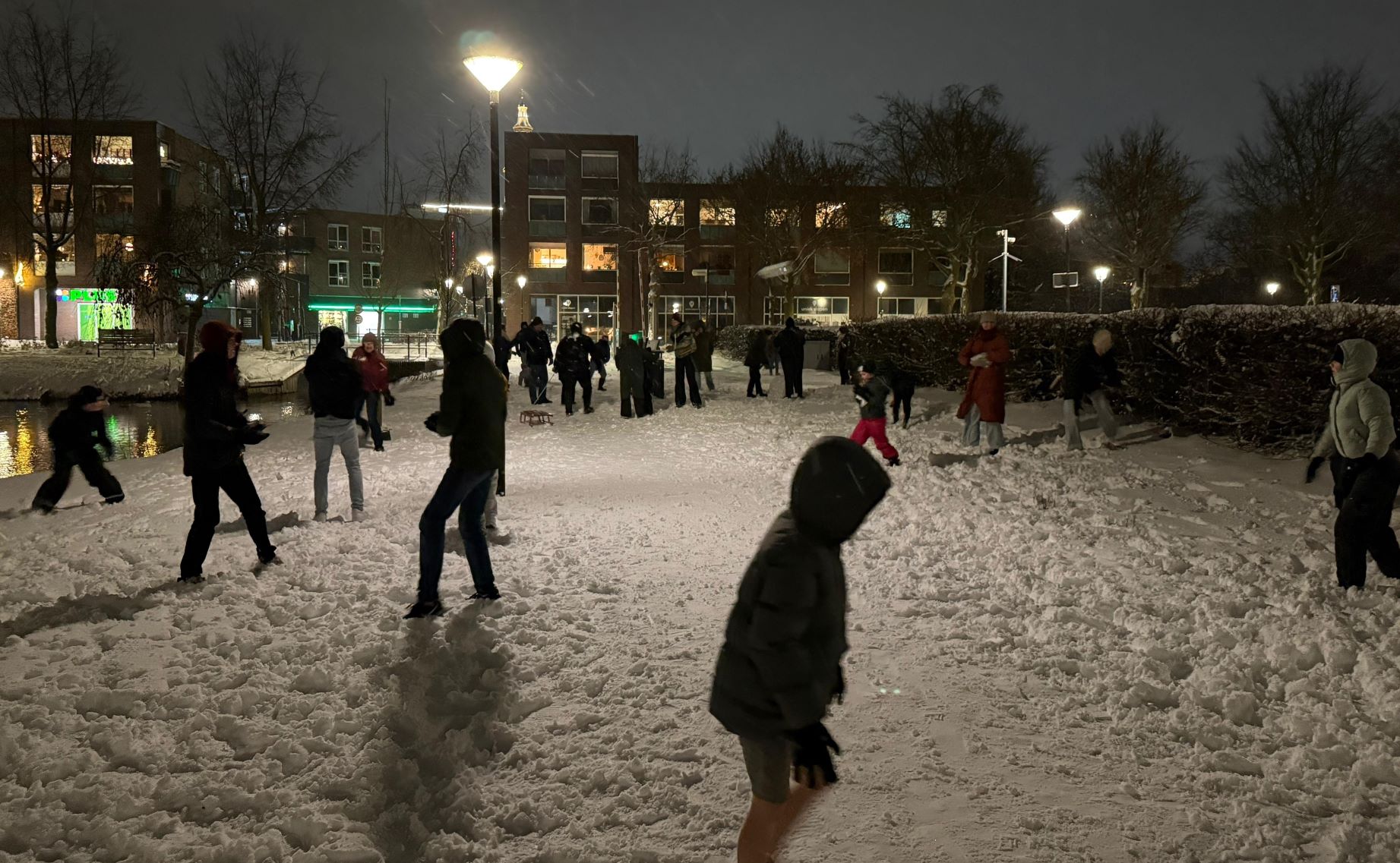 Ongeveer zestig personen hebben woensdagavond 7 januari gehoor gegeven aan de oproep om in het Nijkerkse stadspark aan de Frieswijkstraat deel te nemen aan een sneeuwballengevecht. Maar dat was niet het enige. De sneeuwpret werd ook gebruikt om sociale contacten op te doen en sneeuwpoppen te maken. De grootste sneeuwman was liefst vier bollen hoog, meer dan 2,5 meter. De oproep was afkomstig van Arida, Linda en Miriam die boven de elektronicawinkel van Bokkers en Renes wonen. Ze deelden snoep en warme drank uit aan de aanwezigen. Foto Kees van den Heuvel