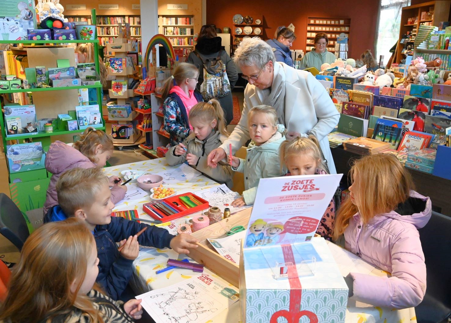 Het was woensdag 18 oktober een drukte van belang bij boekhandel Roodbeen in Nijkerk, want daar kwamen de Zoete Zusjes op bezoek. Kinderen konden langskomen voor een fotomoment, een dansje of een knuffel. Ook lagen er allerlei kleurplaten. Er werd zelfs gebakken met een recept van het nieuwe bakboek van de Zoete Zusjes. Foto Kees van den Heuvel
