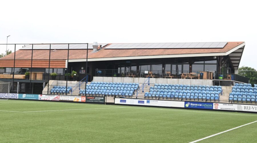 Ook bij voetbalvereniging Veensche Boys in Nijkerkerveen gaan ze voor energiebesparing. Op het dak van het clubgebouw zijn zonnepanelen geplaatst. De 144 panelen zijn zodanig onder de nok aangebracht dat de oorspronkelijke unieke structuur van het dak zo min mogelijk geweld wordt aangedaan. Later deze week krijgt het gebouw aan de buitenkant ook nog een schilderbeurt van Aart van der Kieft. Foto Kees van den Heuvel
